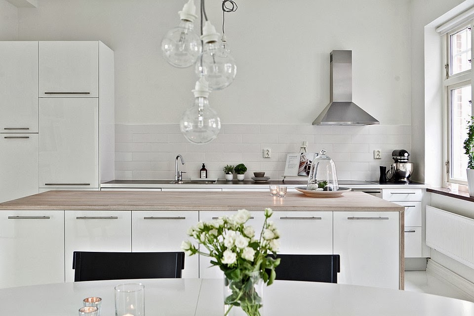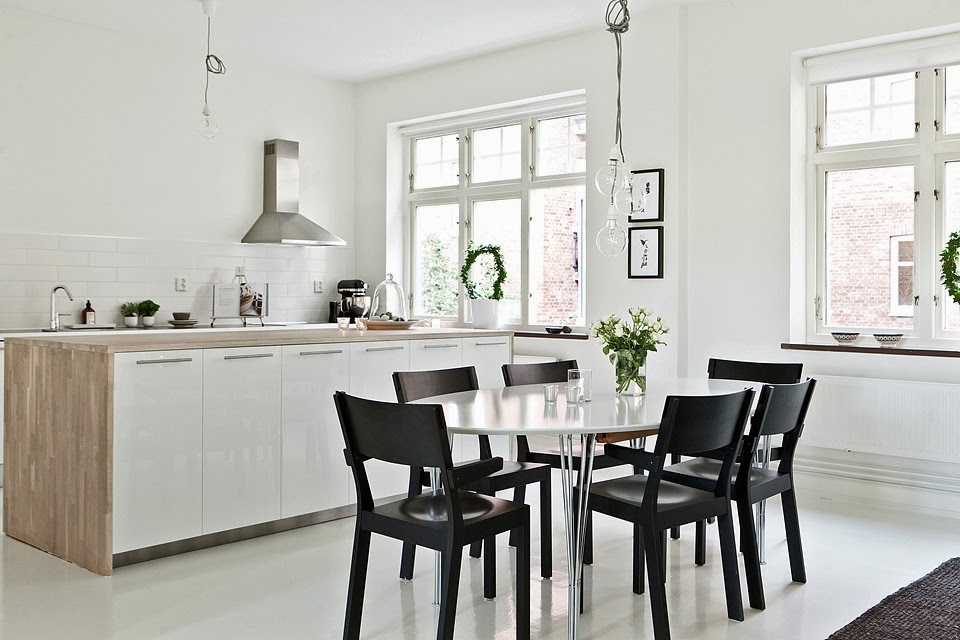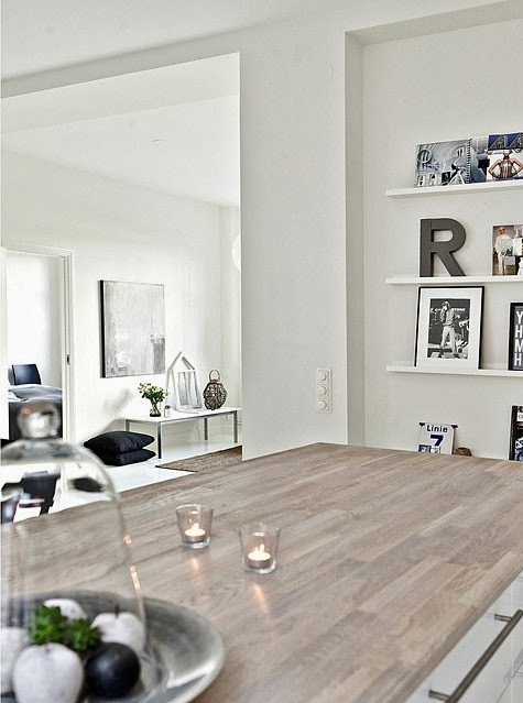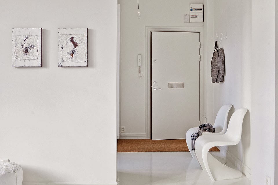 Cada día me entusiasma más la decoración en blanco y madera clara ,es fantástica, se crea una atmósfera serena, limpia, luminosa......ideal para vivir. En este apartamento el blanco esta presente incluso en los suelos, paredes, mobiliario.........PRECIOSO.