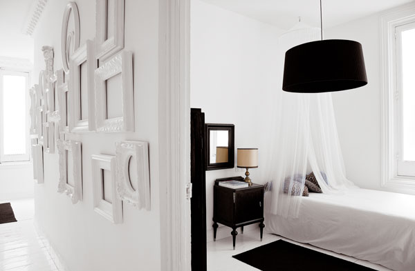 Sobre el fondo blanco, y junto a los detalles negros, algunas piezas clásicas de diseño ayudan a dar el aire contemporáneo a este impresionante piso: la Ball Chair de Eero Aarnio, las butacas Shell de Hans J. Wegner, la lámpara Arco de Flos, la Smoke Chair de Maarten Baas, o las Carbon Chair de Bertjan Pot & Marcel Wanders se unen a piezas experimentales como el sofá chaise-longue Hockney del arquitecto Eero Koivisto para David Design. Algunas antigüedades como las lámparas de araña traídas de Paris y diseños propios de Polo, como el espejo Twenty-Seven, acaban de rematar la decoración de esta ecléctica pero refinada vivienda
