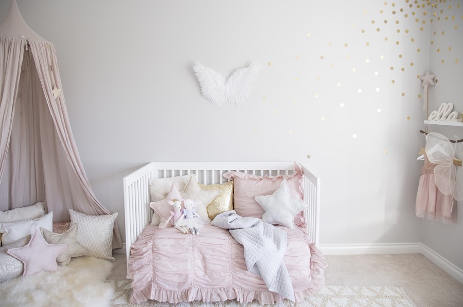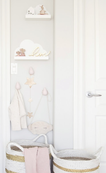 Ver esta habitación y no sentir un flechazo es imposible, la paleta de colores pastel y el millón de detalles que tiene hace que te quedes pegada a la pantalla. Empezaré por las alas que presiden la zona de descanso, justo encima de la cuna, me parece una idea genial prescindir del típico cuadro o lámina e incorporar otro tipo de decoración, de hecho yo lo hice en el espacio que habilitamos en nuestro dormitorio para la llegada de la peque, colocando un cojin con forma de estrella. ¿te acuerdas?