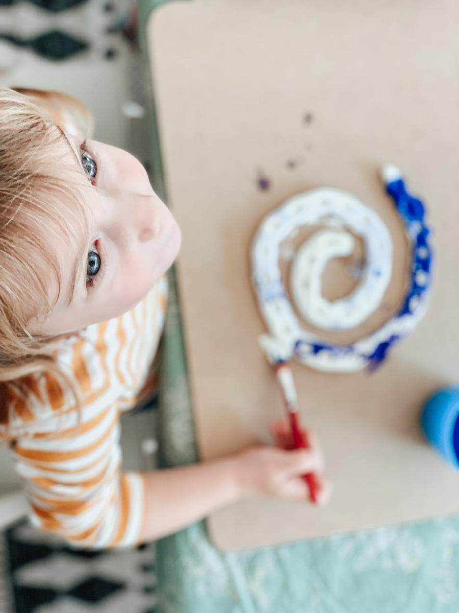 Para ello, hicimos una espiral con un poco de arcilla blanca (podéis recordar el post del atelier de arcilla para coger ideas), la pintamos con colores de invierno y también pusimos un poco de purpurina lila. Hicimos tantos agujeros como días tendría el espiral y enganchamos velas en cada uno de ellos.