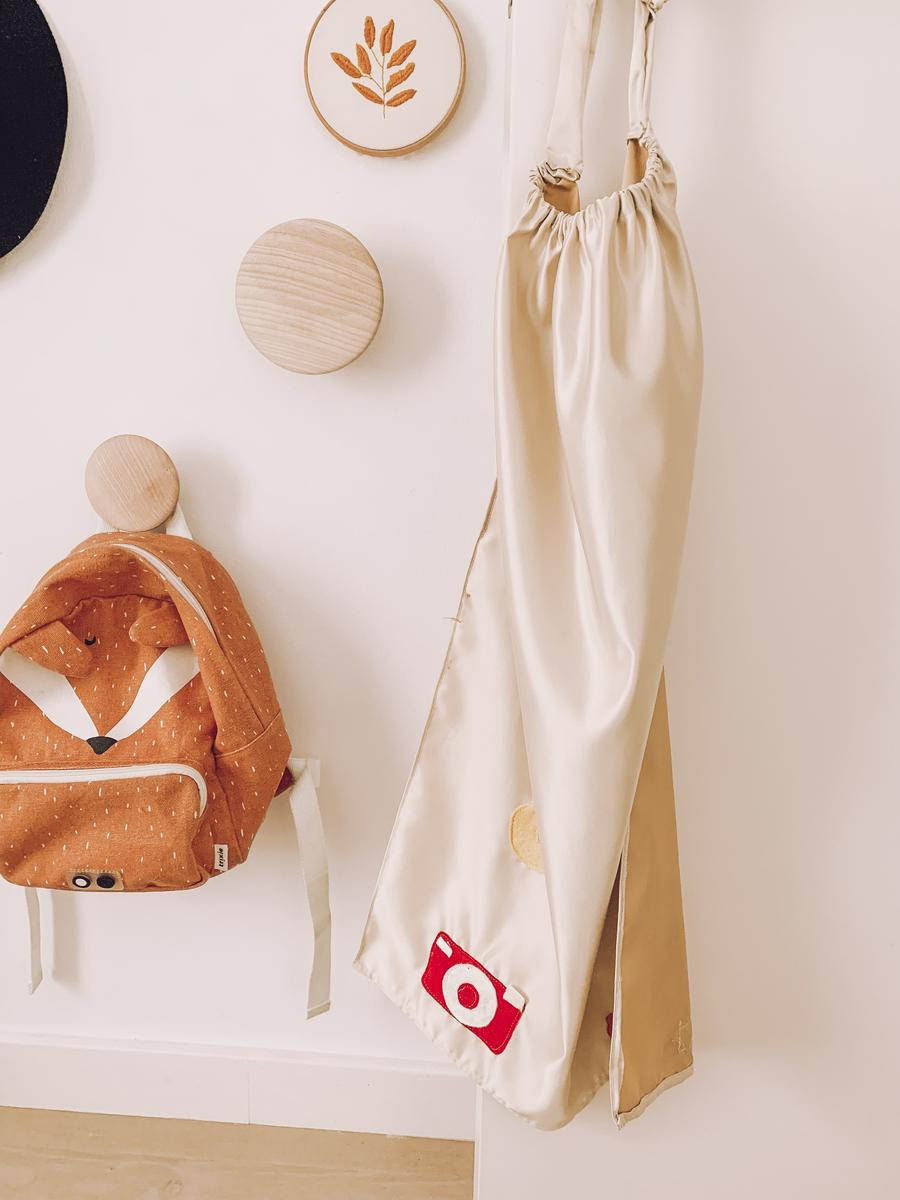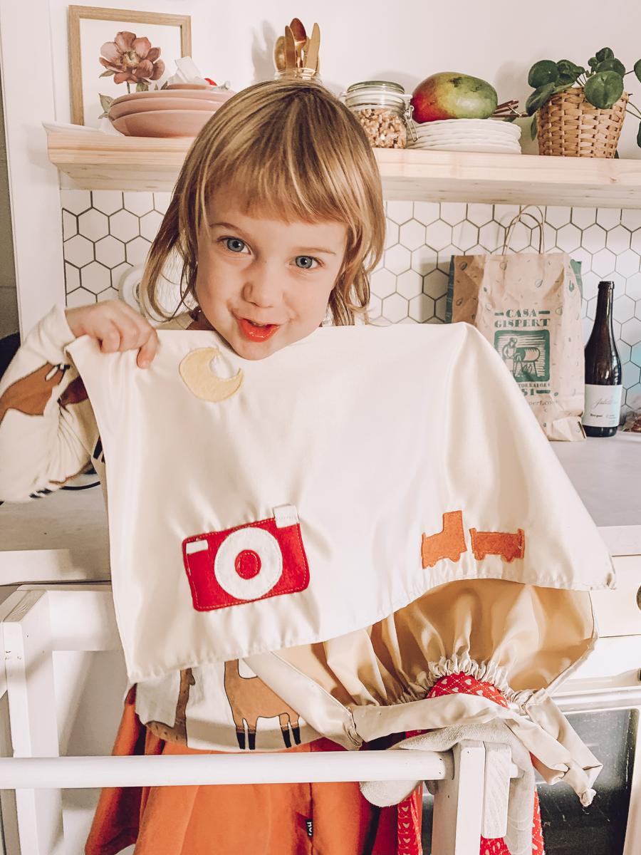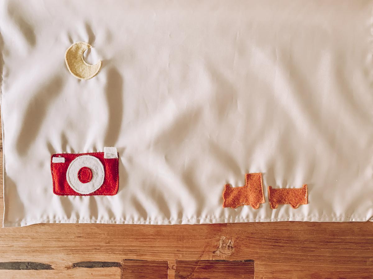 Y por otro lado también hemos preparado su capa de cumpleaños. Por esto también me habéis preguntado mucho. En la escoleta de Valentina, cuando cumplen un año les regalan una capa. Esta capa, es la capa que les acompaña en todos sus cumpleaños, y cada año se va añadiendo un elemento. El primer año (y el segundo) fuimos nosotros los que decidimos el elemento que cosimos a la capa según aquello que más le apasionaba en ese momento. Así fue como cosimos una luna en su primer aniversario y un tren en su segundo. Para este tercer año, empezamos a hablar hace unas semanas de qué era aquello que le gustaba mucho, que le apasionaba. Nosotros también nos poníamos como ejemplos en las conversaciones, aprovechábamos los momentos de la cena en la que estamos los 4 y así fue como decidió que quería que le cosiera una cámara.
