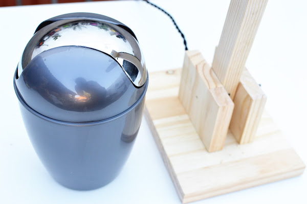 Y para terminar hay que buscar la pantalla, la mía es una pequeña papelera que encontré en un bazar, es de plástico, pero como las bombillas que se usan ahora no se calientan, no tienes que preocuparte si eliges ese material. También puedes hacer la pantalla con una maceta, un vaso o incluso una lata de conserva....¡lo que te diga tu imaginación!