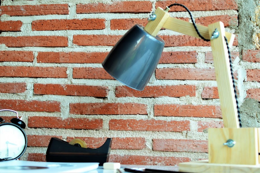 Este es el resultado de la lámpara... y de mi nuevo rinconcito, me ha gusta mucho el resultado, creo que el ladrillo, el mármol y la madera es la mezcla de texturas perfecta, estoy segura de que voy a trabajar muy agustito aquí. ¿A ti qué te parece?