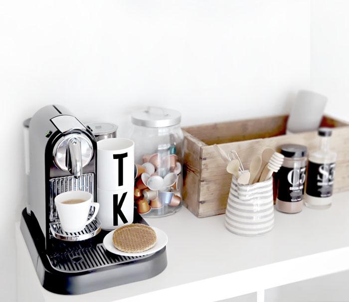 Si la zona de café va a estar en un lugar visible procurad tenerla ordenada y con las cosas que vayáis a necesitar a mano para que resulte lo más cómodo posible a la hora de prepararlo. Para ello utilizad piezas y objetos bonitos y diferentes que os ayudarán a decorar, una caja de madera o una bandeja donde colocar las tazas, platos y la jarrita de la leche, unas latas o botes originales donde guardar las cápsulas del café y las bolsitas de té, un azucarero y un servilletero vistoso, un vasito para colocar las cucharillas, una caja de galletas etc., pequeñas cosas que darán al espacio un toque especial.