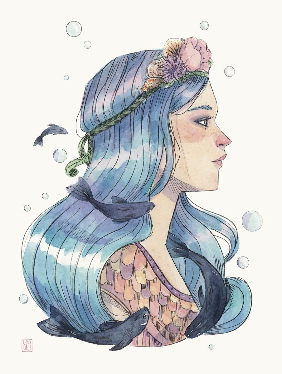 Runa es la encargada de las corrientes marinas, de sus trayectos y sus temperaturas. Algunas veces es posible verla divertirse y fluir con el plancton, las algas y los alevines más inquietos, a los que les gusta jugar al escondite entre su pelo. Dicen que su corona se la regaló la mismísima Océano en persona, que la mandó tejer a las deidades abisales, famosas por la delicadeza de sus trabajos trenzados a ciegas. Se dice también que en ella usaron elementos recolectados de los siete mares de la antigüedad y que guarda un gran poder, podría resultar peligrosa si cayese en malas manos. | Microrrelato de @wayaiu