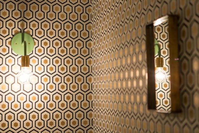 Papel pintado de estética sesentera, lavabos cerámicos circulares sobre un tablero de madera recuperada y revestimiento hidráulico para un baño adorable (sí los baños de los restaurantes pueden serlo!!)