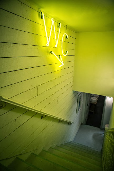 ¿Bajamos al baño? un gran neón amarillo nos indica dónde está y las escaleras de colores nos guían hasta él...