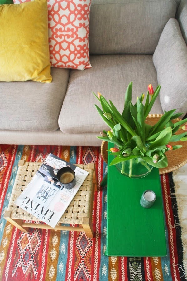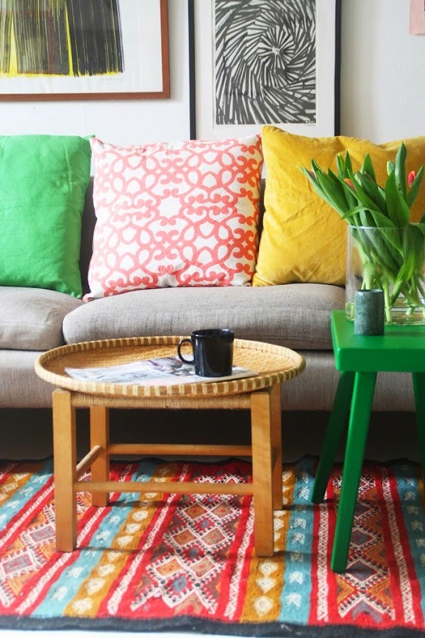Esta casa llena de contrastes y color es la que hemos escogido para empezar con buen humor el domingo. De verdad que el tiempo gris y la lluvia incesante que no para de caer, empieza a darnos un poco igual, y para atacar tanta "apatía" y que no se nos acabe quedando la cara sin color, hoy nos apetecía una casa alegre y viva!DECO sencilla, ideas lowcost (no es perfecta esta mesa y el sofá ...