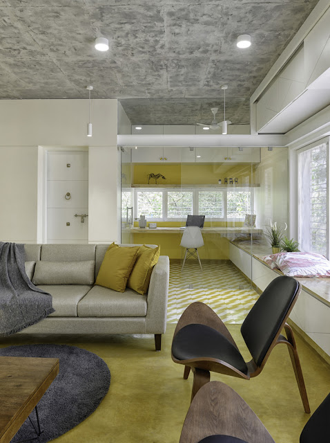 Elige acabados en blanco para los revestimientos, suelos o las encimeras de cocinas o baños. Y da el color en toques como sillas y complementos.Zona de despacho en amarillo y blanco.