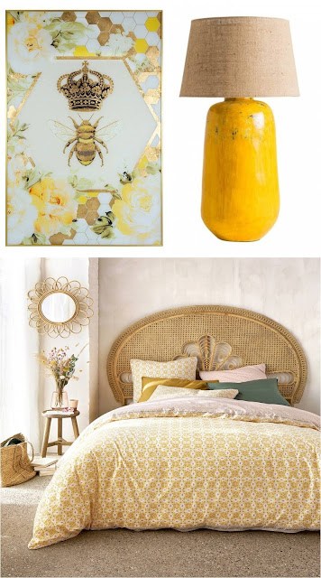 En estilos más clásicos o modernos, con un punto de glamur o sencillez, cuadro de colmena con abejas (OHCIELOS), lámpara (KULUNKA) y funda nórdica (LA REDOUTTE).