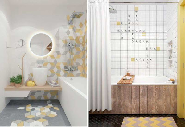 El nuevo beige “orgánico” irrumpe con fuerza creando ambientes naturales abiertos al exterior. El amarillo te servirá para enfocar puntos de atención. Ambientes serenos y relajados, perfectos con madera clara, piedra o paramentos blancos.Baño en amarillo y beige.