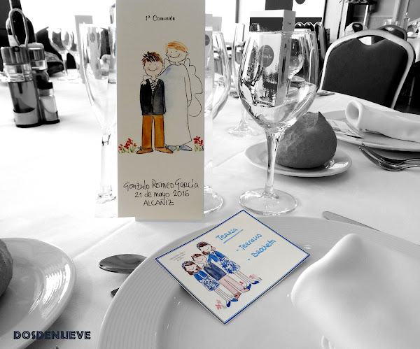 Con las mismas acuarelas se realizaron unas tarjetas para marcar el lugar en el que debía sentarse cada invitado y otras con el menú de la celebración.