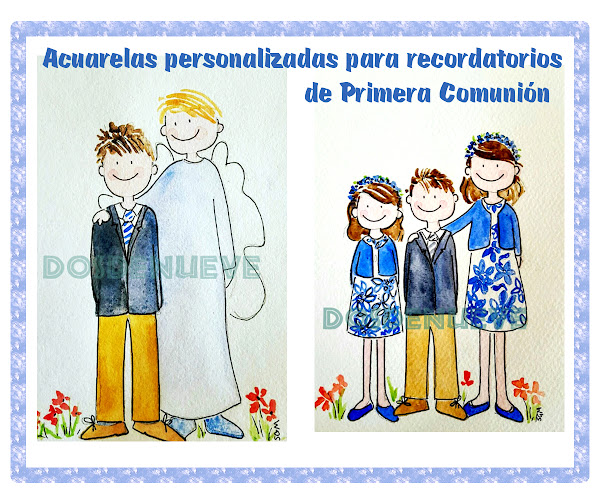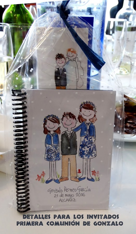Nuestra hermana Arantxa (y madre de Gonzalo, el comulgante) se encargó de preparar estos bonitos detalles para los invitados. A partir de las acuarelas realizadas por Susana, encargó unos marcapáginas y unas libretas y los presentó en una bolsita de celofán cerrada con una lazo azul.