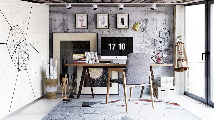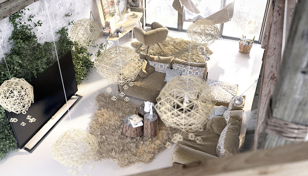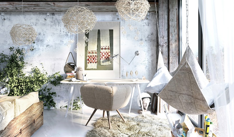 Con el techo a dos aguas, se crea una entreplanta a modo de altillo que aprovecha la altura, con un forjado de vigas de madera en estilo rústico. La cocina se realiza en madera siguiendo la línea de campo con muebles hechos a medida a modo de contenedores y cajas de almacenamiento y las paredes de hormigón crean un contraste industrial perfecto. Cada espacio hace su personal referencia al estilo cottage como los sofás con tela de saco, el mimbre de los cestos y lámparas, las plantas trepadoras como si saliesen de las paredes y el suelo... Al baño se accede por una puerta corredera de granero recuperada. Es como pasar a un oasis de tranquilidad en mitad del campo. El dormitorio y la zona de estudio se sitúa en el altillo, buscando intimidad pero sin cerrar el espacio en sí. El concepto es un poco loft.