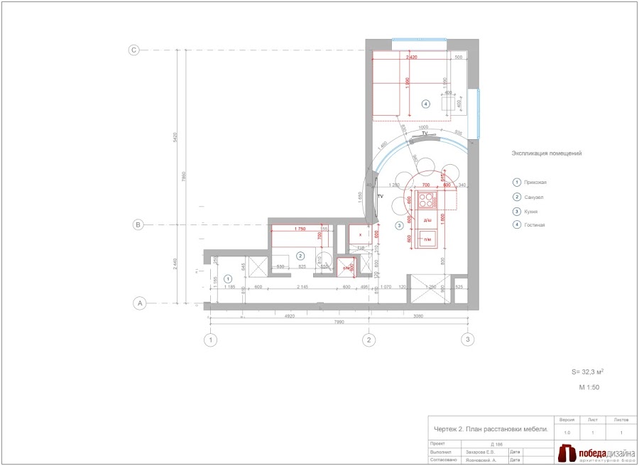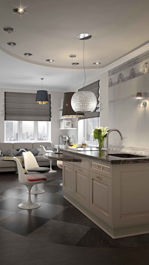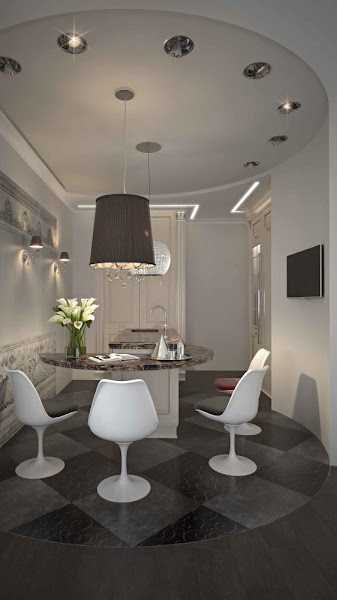 La vivienda resulta ser una especie de codo en L en su geometría, lo que complica los espacios y su distribución. En el interior hay vidrio, cromo brillo. El suelo tiene una textura brillante así como la puertas correderas de vidrio (vidrio esmerilado, posiblemente, con un patrón). Al colocar la zona de cocina en la parte central de la planta, se crea una barra a modo de office circular con sillas Tulip, para crear una circulación suave y continua en el tránsito de las distintas estancias abiertas y comunicadas entre sí. Se busca maximizar el espacio en el plano visual. La cocina completa y el comedor se identificó por los suelos en un diseño de tablero de ajedrez y con mayor altura del techo. En la composición general de los dispositivos de iluminación son muy importantes.