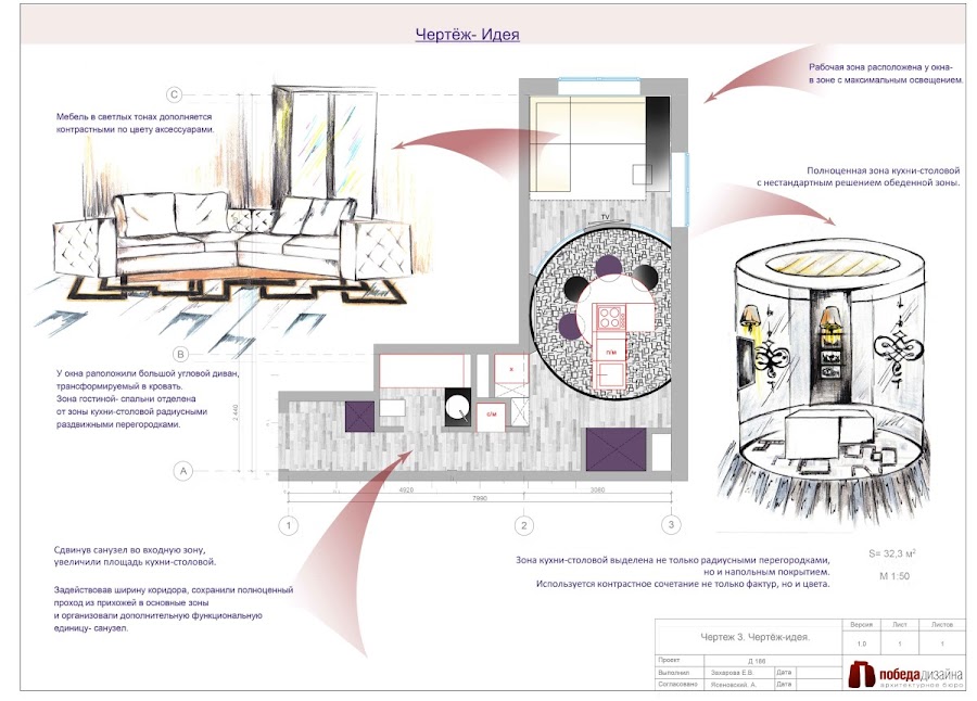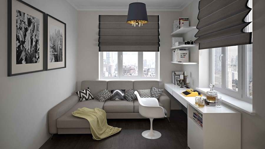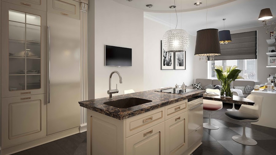 En la sala de estar de poco de espacio, prima la funcionalidad. El sofá hace las veces de cama con preciosas vistas y cuenta con una zona de trabaja confortable iluminada por la luz natural. Un acento llamativo son las lámparas de diseño con interior dorado y la de araña de la cocina. El conjunto resulta elegante y pensado al detalle ¿qué os parece este mini espacio? ¿Y la solución de la cocina circular?