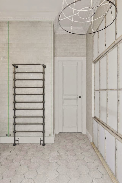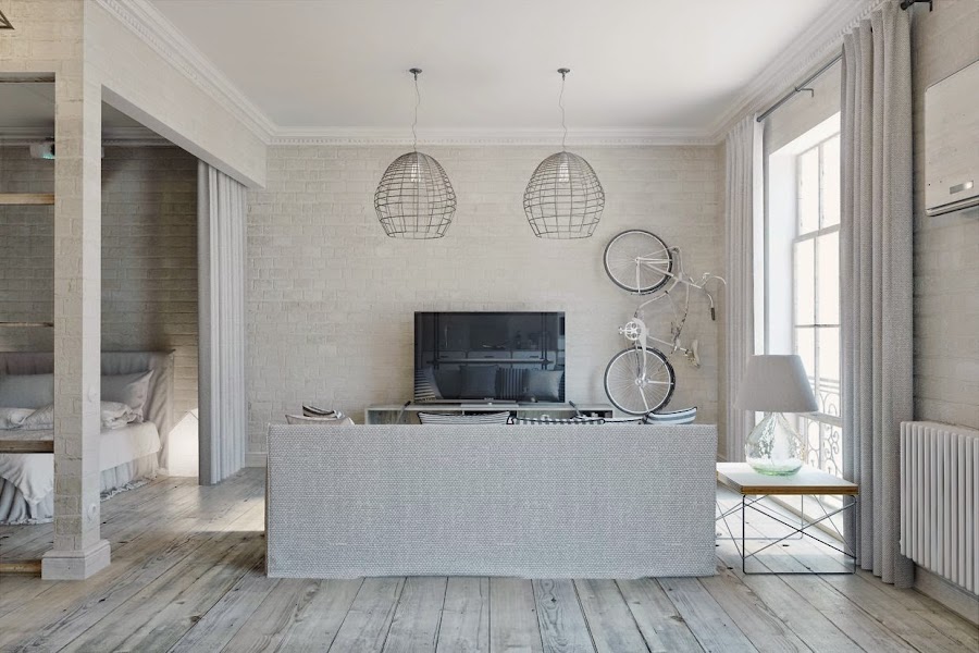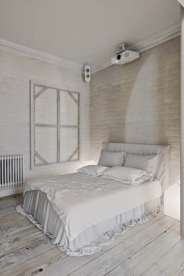 La cama separada de la zona pública se realiza mediante cortinas de lino. También se ubica una pantalla de altavoces de cine para casa equipados con sonido y decoradas en un estilo minimalista, muy adecuado para el diseño general de la vivienda. El espacio para el baño en este apartamento y siguiendo la línea de "colores" brillantes se realiza con la fontanería en blanco muy brillante y retro, que destaca suave contra el "ladrillo" gris y la mampara de cristal templado que cierra el espacio. El solado en cerámico hexagonal es una idea perfecta para rematar el espacio ¡ME HA ENAMORADO!