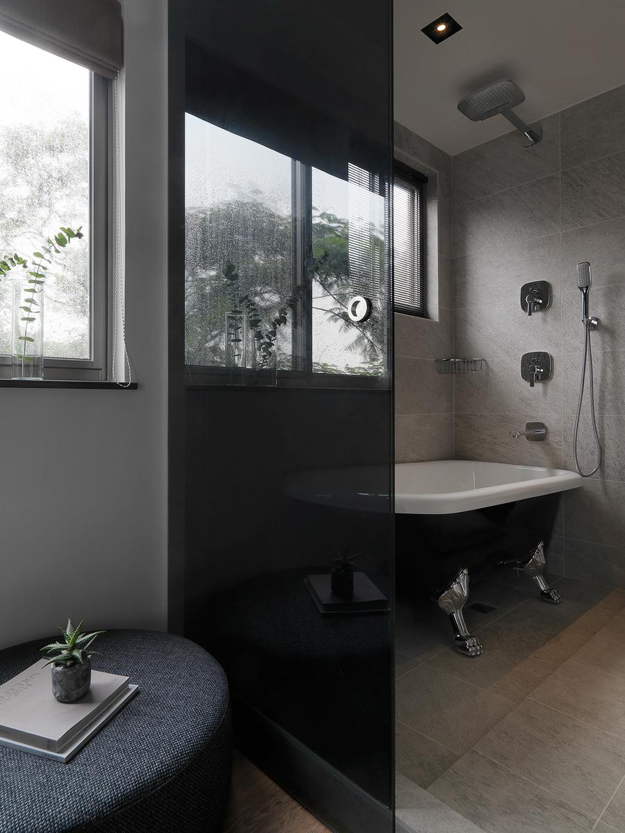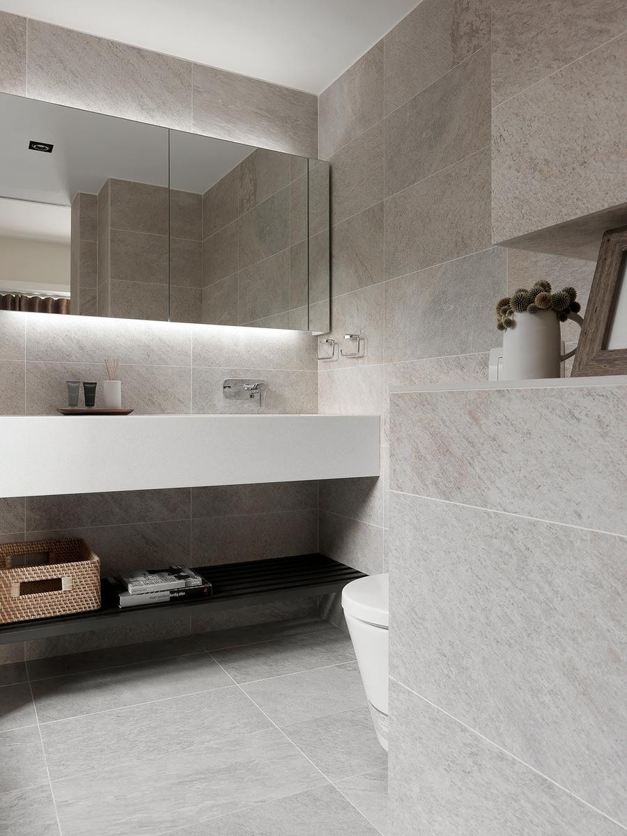Colores y líneas simples para crear una escala de color de baja graduación en blanco y negro, en calma, además del neutro de las baldosas de arenisca para brindar estabilidad.