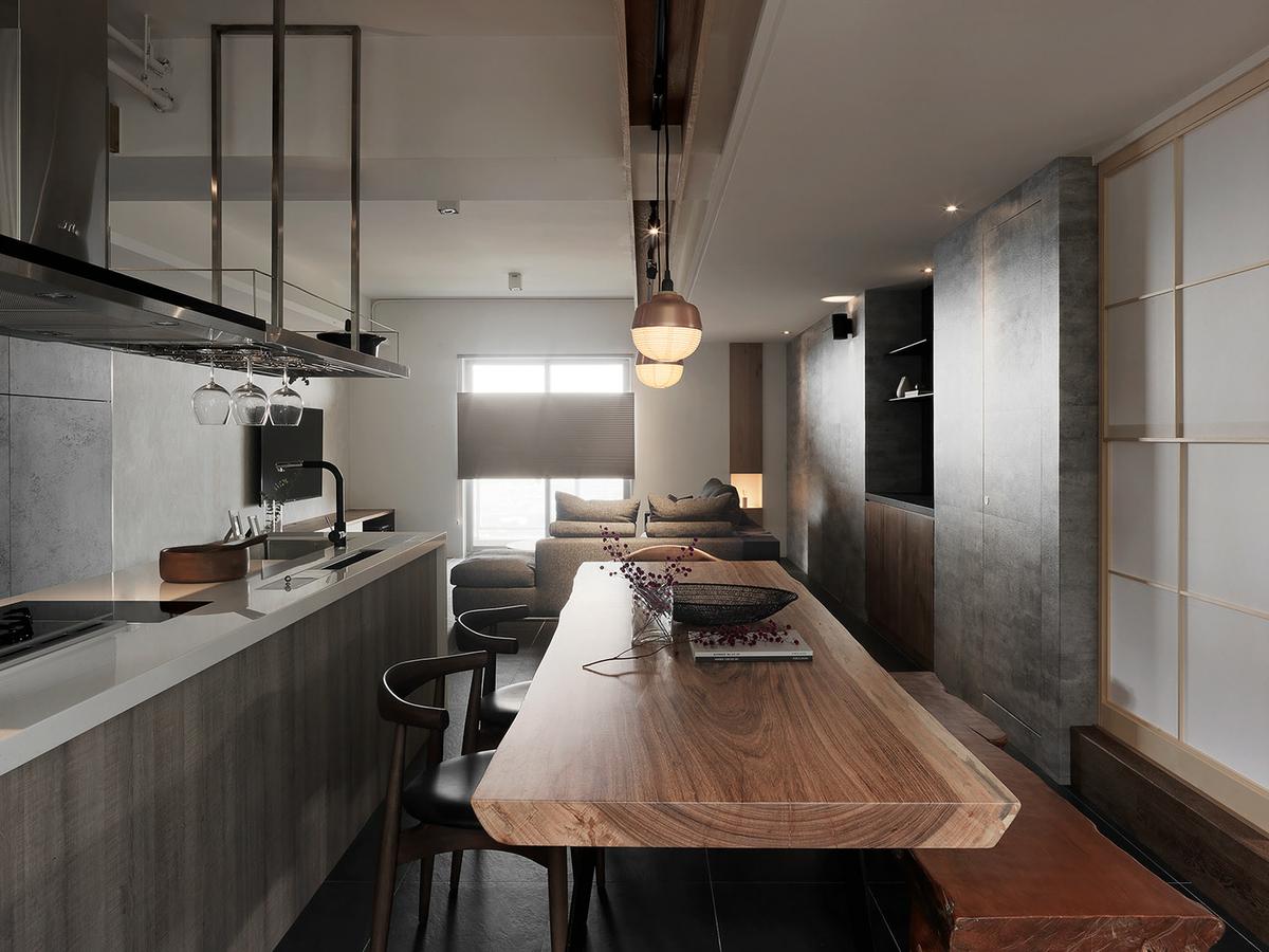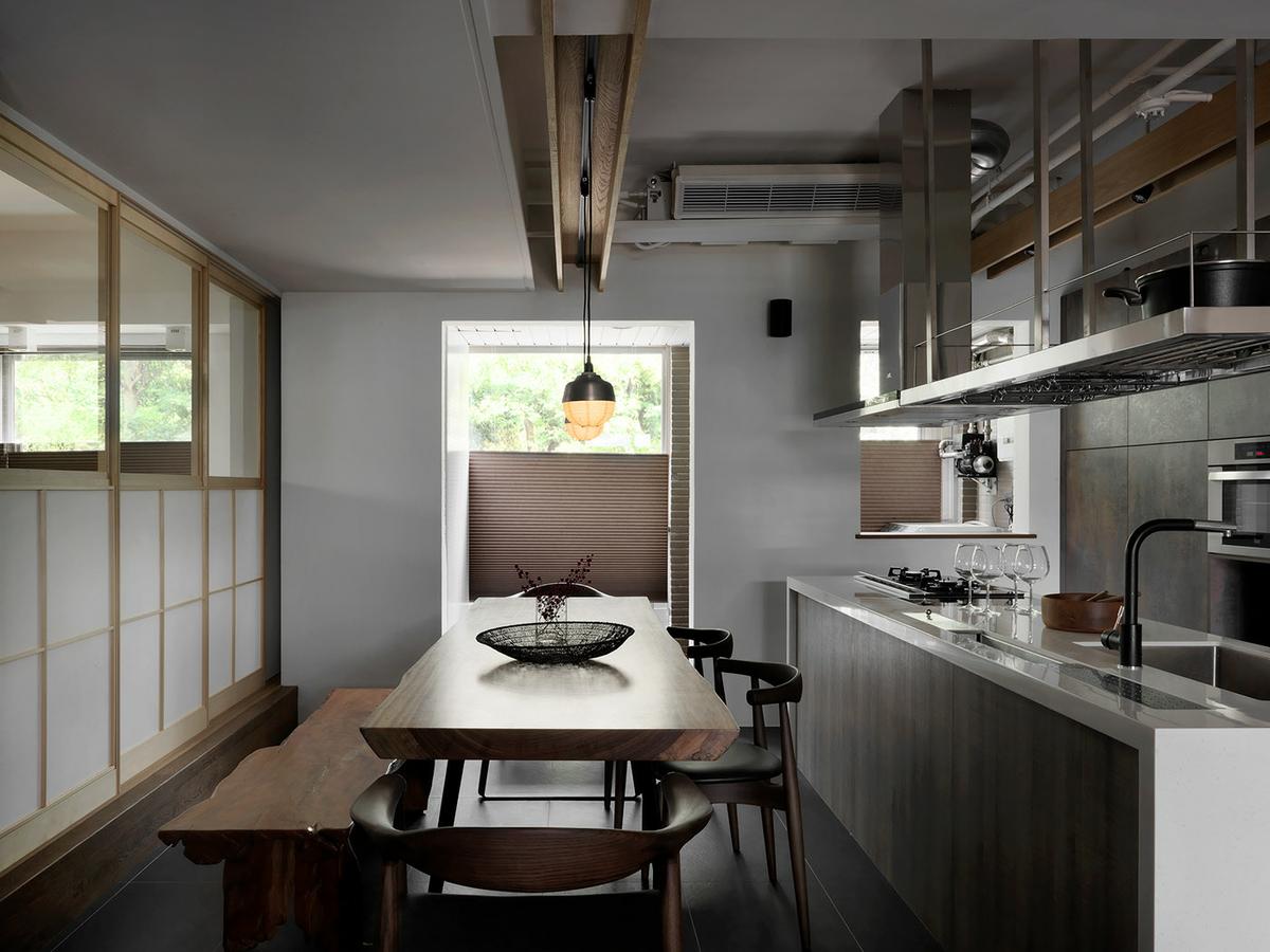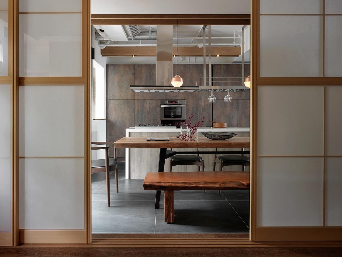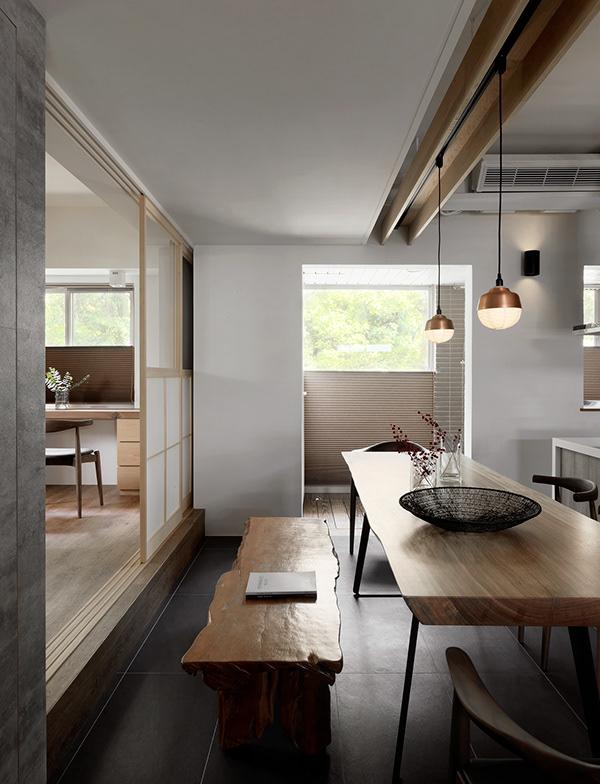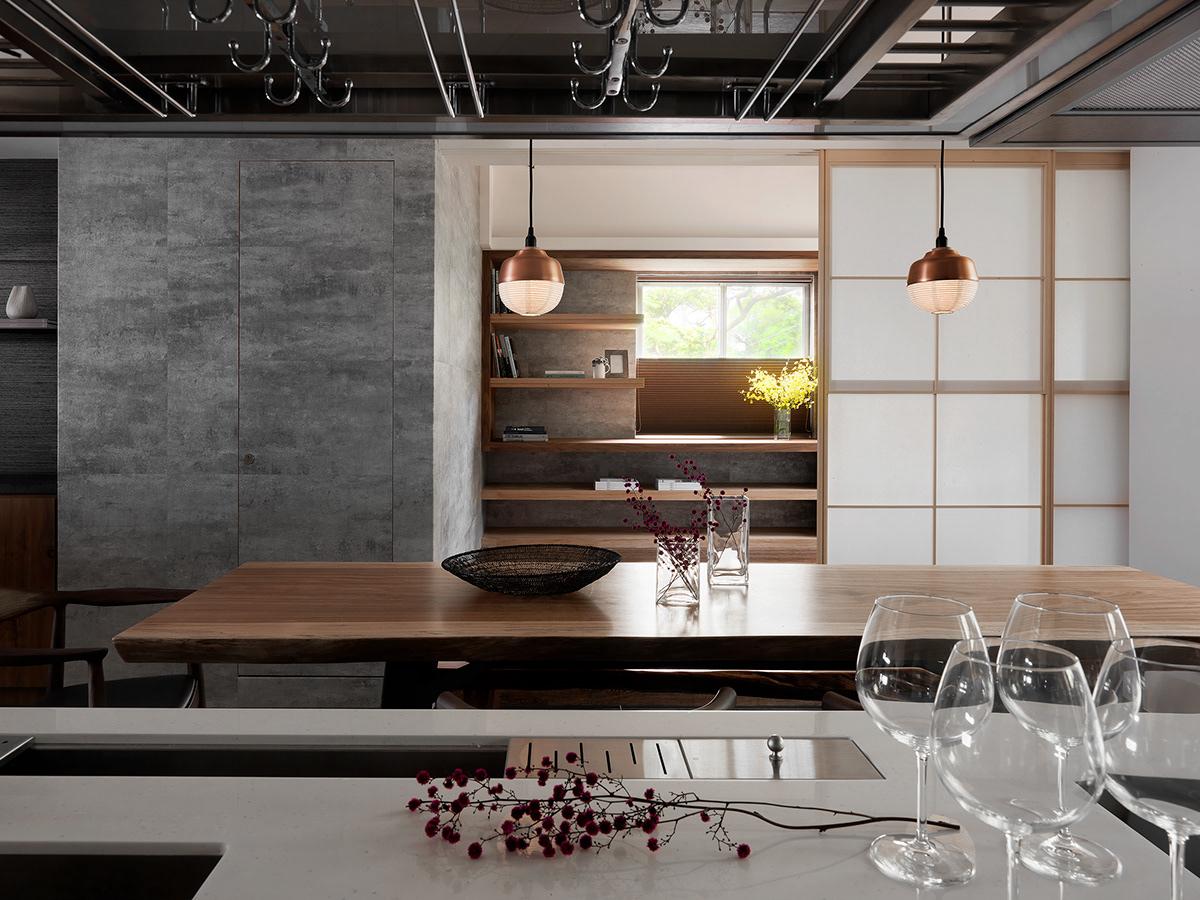 La buena luz diurna es brillante durante el día, con lo cual se crea énfasis en la iluminación de acento indirecta, con un techo que mantiene la altura original. El diseñador desea conectar los bloques funcionales en una forma larga e integrar las luces de riel. Las líneas logran una variedad de efectos, con acabados en cobre y papel, sin robar la vista de la ventana, haciéndose eco del diseño Zen.
