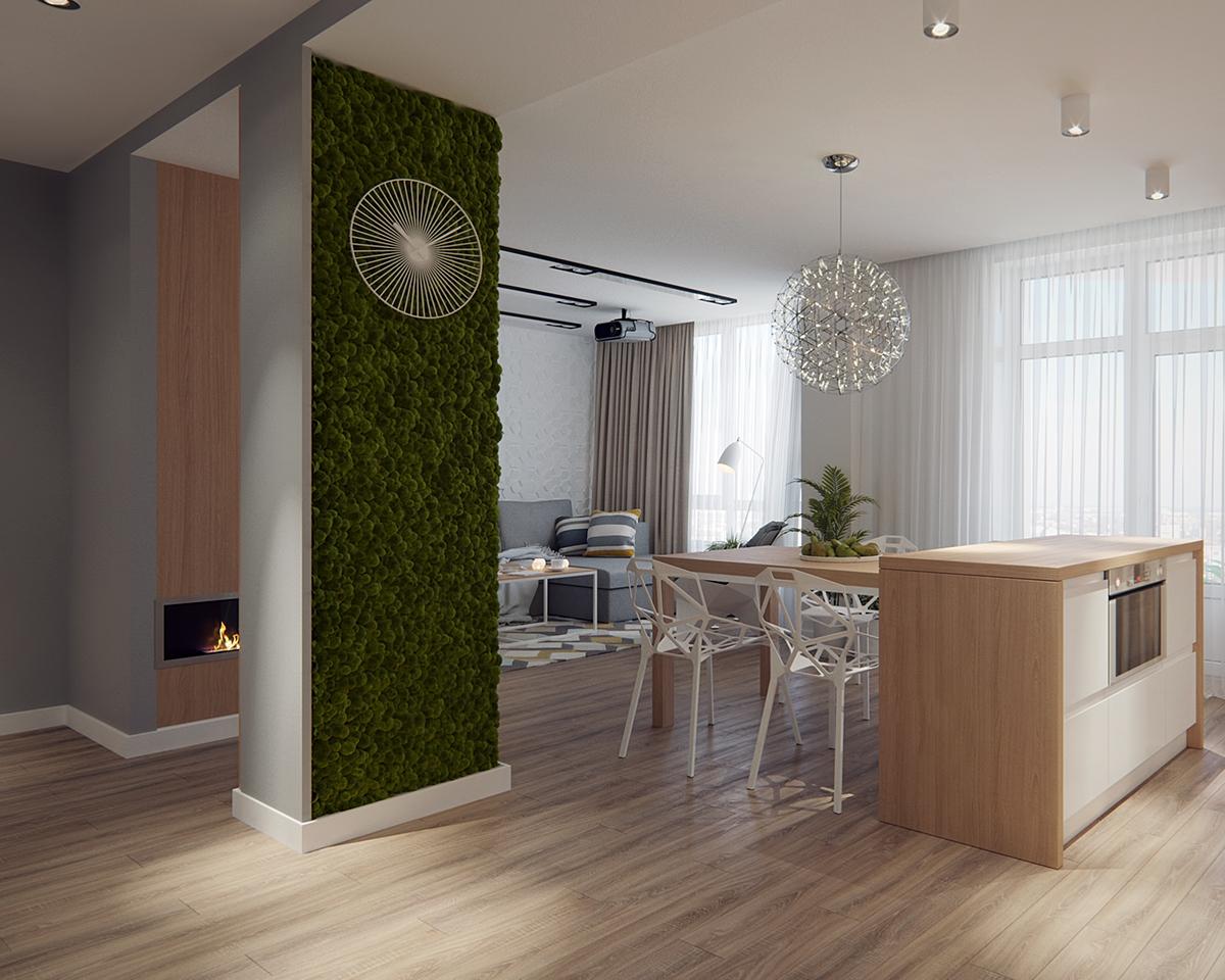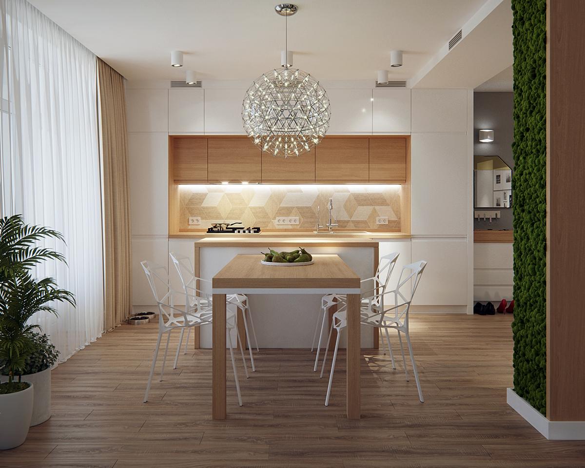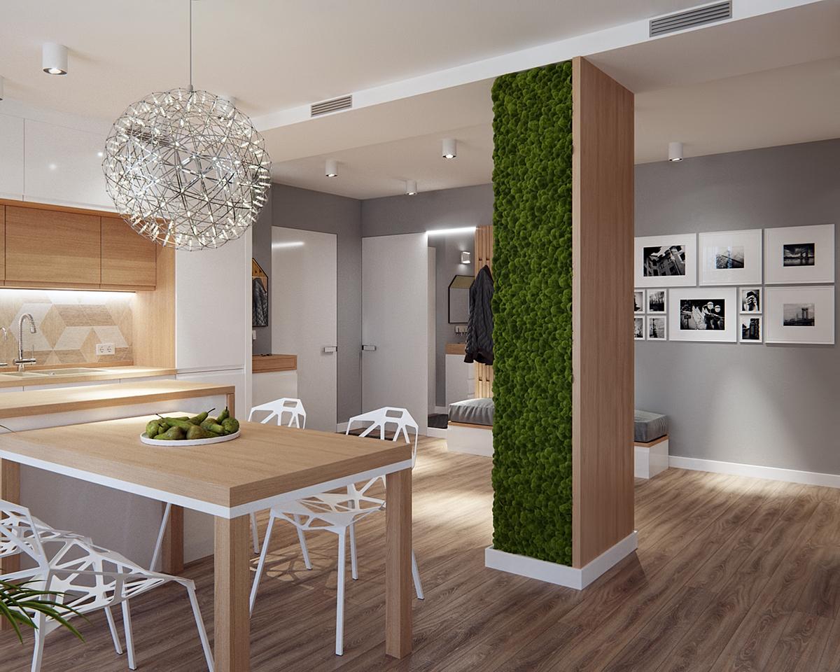 La comodidad es la clave de este proyecto. En el pequeño comedor, la madera natural se transmite tanto en la mesa como en el solado. Además de los muebles de la cocina y las encimeras de madera, le aportan un toque encantador y muy natural. Además, no hay mejor manera de incorporar la naturaleza a un diseño, que el uso de plantas reales, como se ve en la pared de musgo única y moderna, que también actúa como un divisor entre la cocina y las áreas de estar.