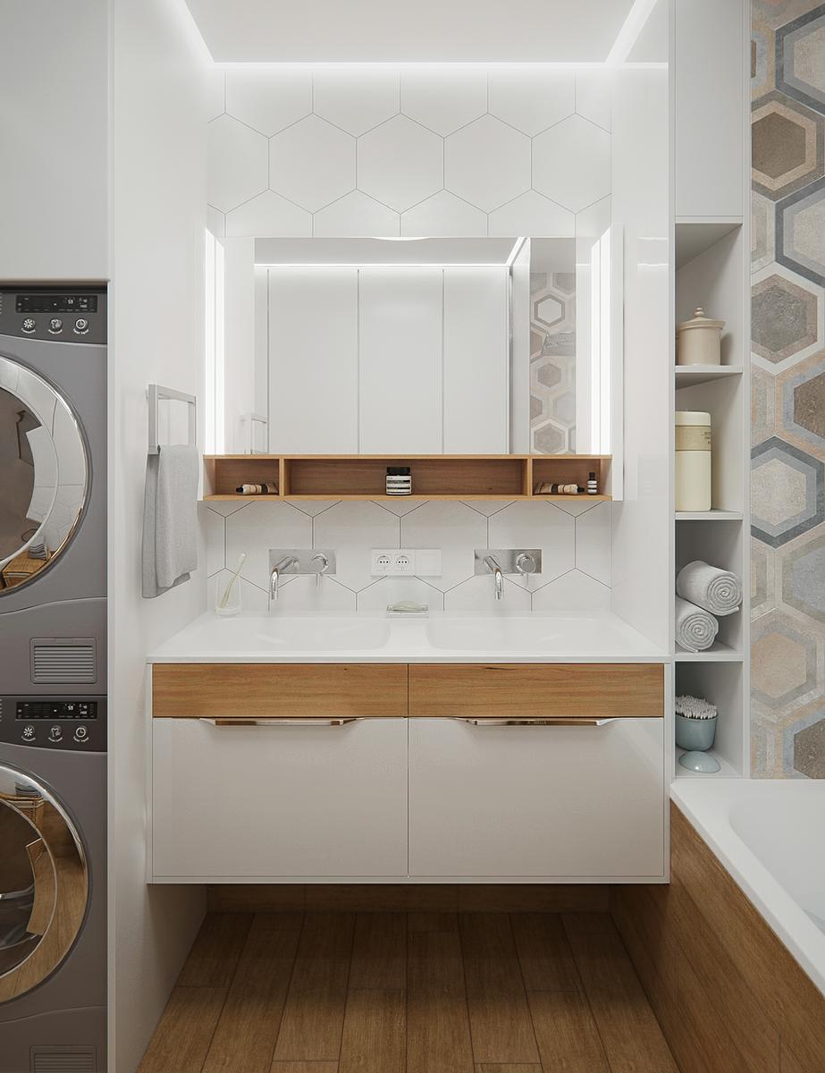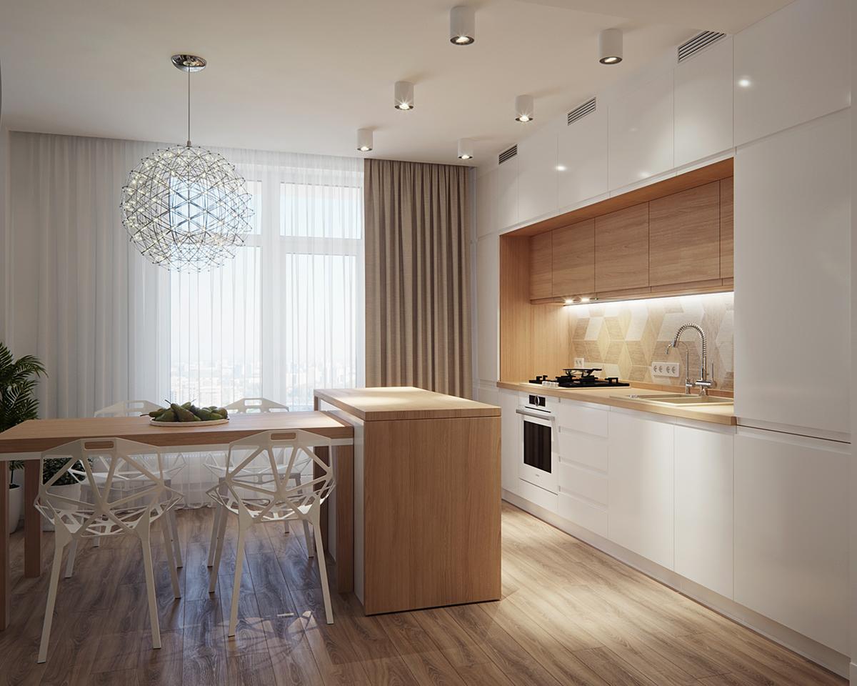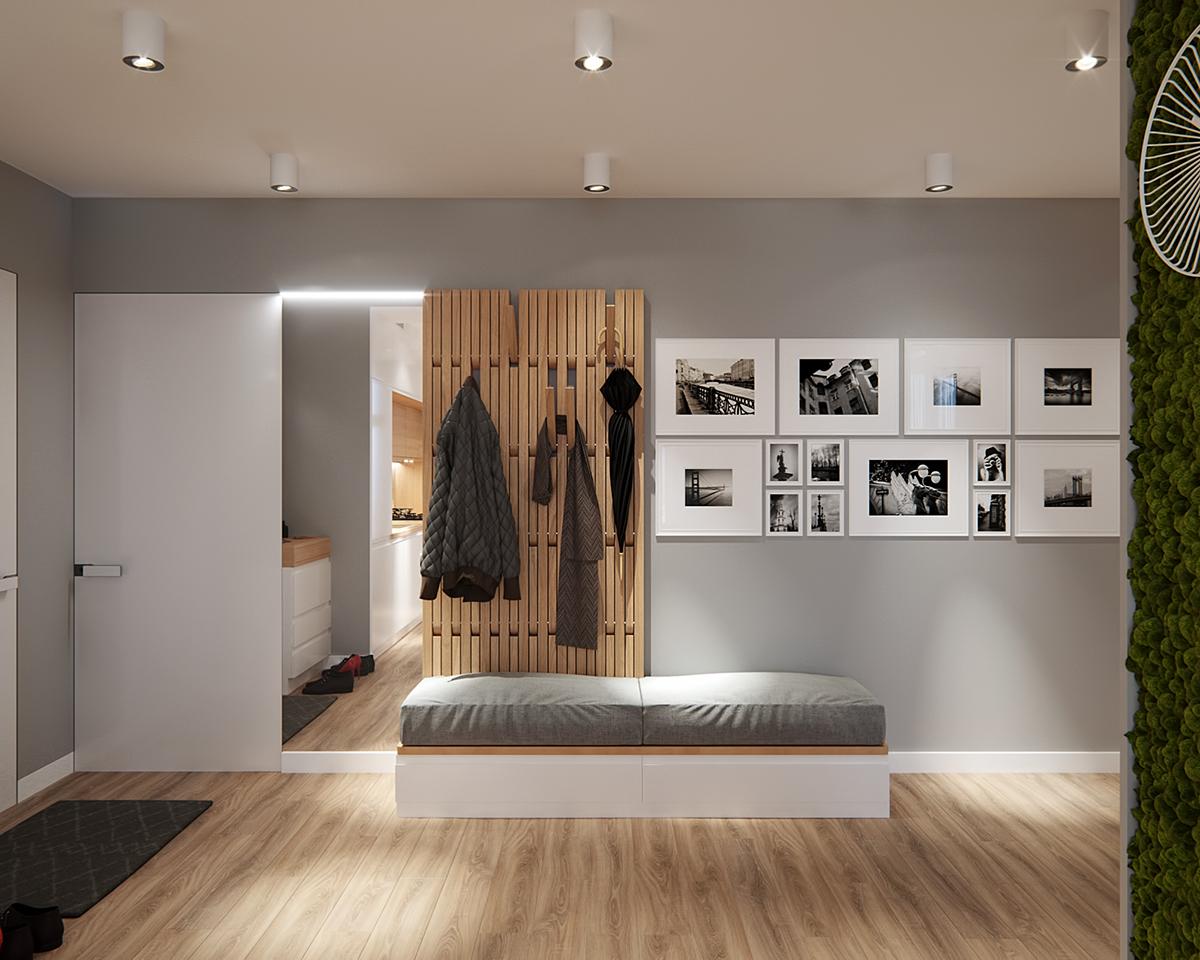 La comodidad es la clave de este proyecto. En el pequeño comedor, la madera natural se transmite tanto en la mesa como en el solado. Además de los muebles de la cocina y las encimeras de madera, le aportan un toque encantador y muy natural. Además, no hay mejor manera de incorporar la naturaleza a un diseño, que el uso de plantas reales, como se ve en la pared de musgo única y moderna, que también actúa como un divisor entre la cocina y las áreas de estar.