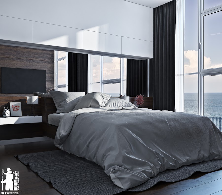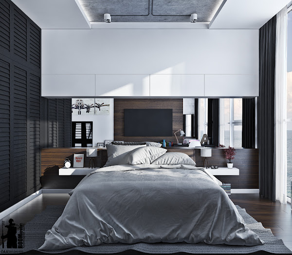La pared continua de hormigón visto para la zona de tv hace las veces de paramento y de elemento decorativo con luz. Con una paleta de color en gris, blanco y negro se consigue un espacio lleno de calidez y serenidad sin que resulte muy oscuro ni apagado. El dormitorio cuenta con muebles altos integrados que permiten almacenamiento y sigue con la línea moderna y masculina decorativa. Con el espejo a modo de cabecero, se consigue amplitud de espacio y lumonosidad, pues refleja toda la luz que entra con el ventanal.