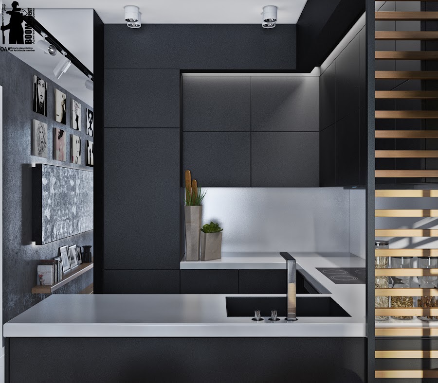 En el proyecto de esta semana quiero mostraros como en pocos metros se puede crear una ambientación llena de personalidad y carácter masculino ganando en estilo y jugando con piezas de arte llenas de fuerza visual. El espacio en principio es de geometría rectangular, por lo que el diseño y la distribución de todo el espacio viene condicionada por ello. Para ganar continuidad y uniformidad se proyecta un solado de madera en toda la zona de estar que queda abierta a modo de loft como una cocina-estar-comedor totalmente comunicado. La cocina en U, aunque de pocas dimensiones, cuenta con todo lo necesario para un apartamento de un soltero y juega con el diseño natural con una estructura de madera y metal y con el verde de las plantas y con todo integrado.