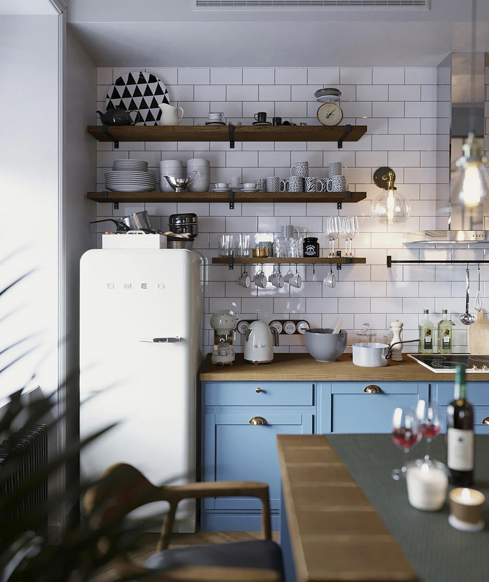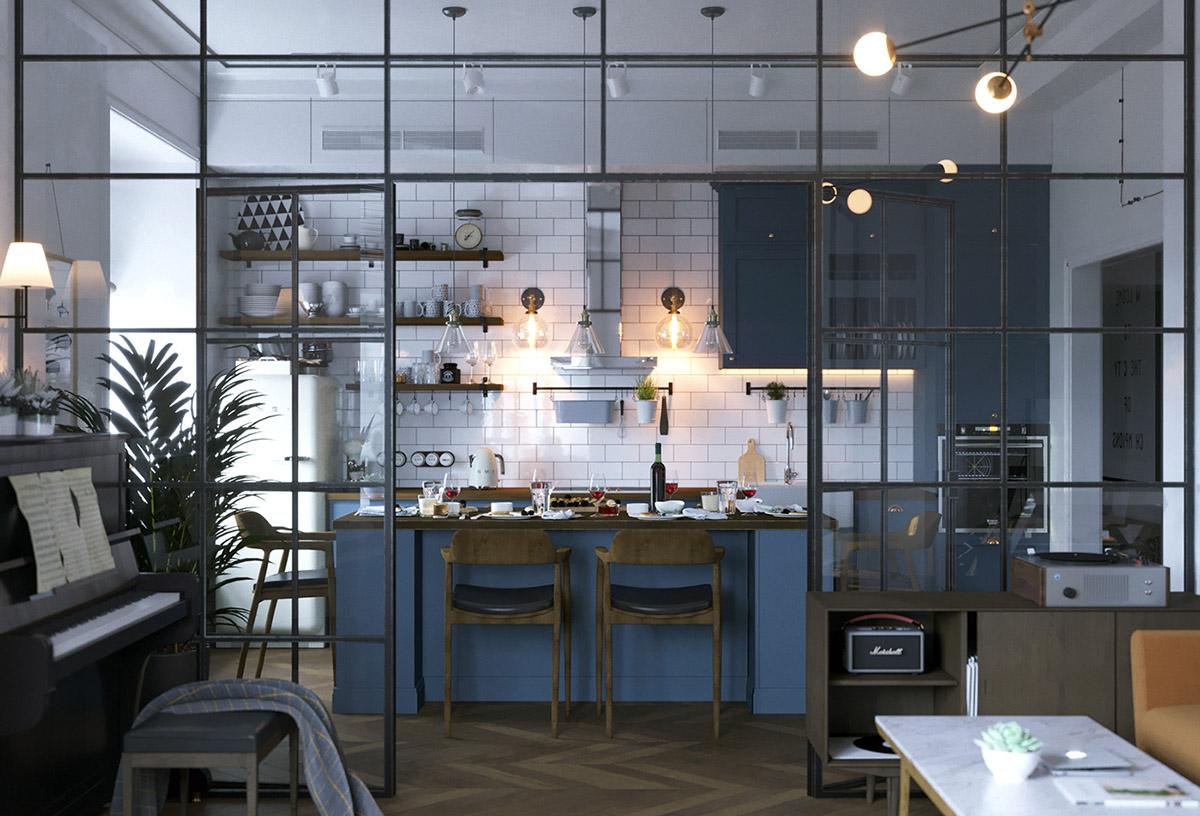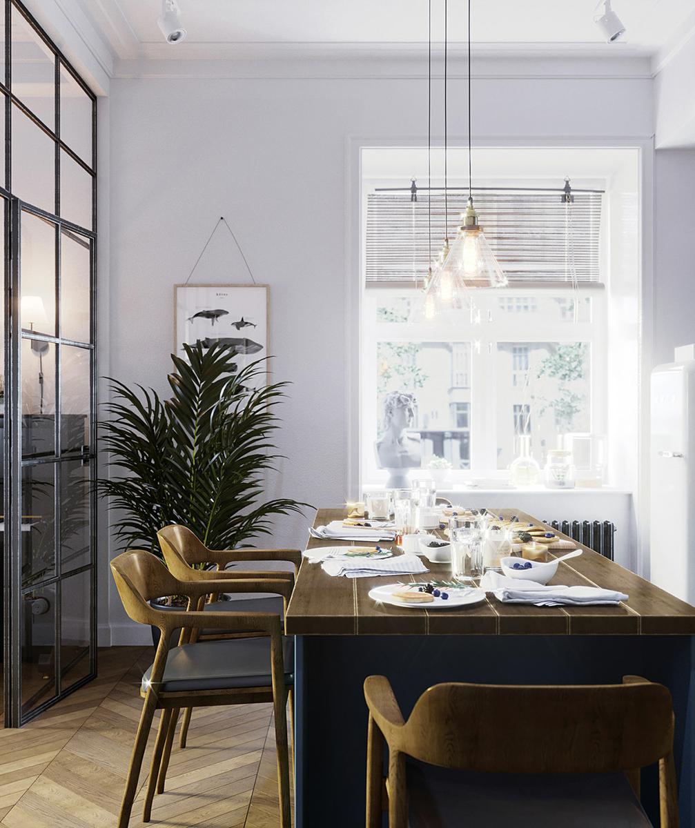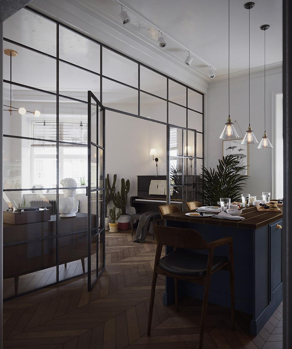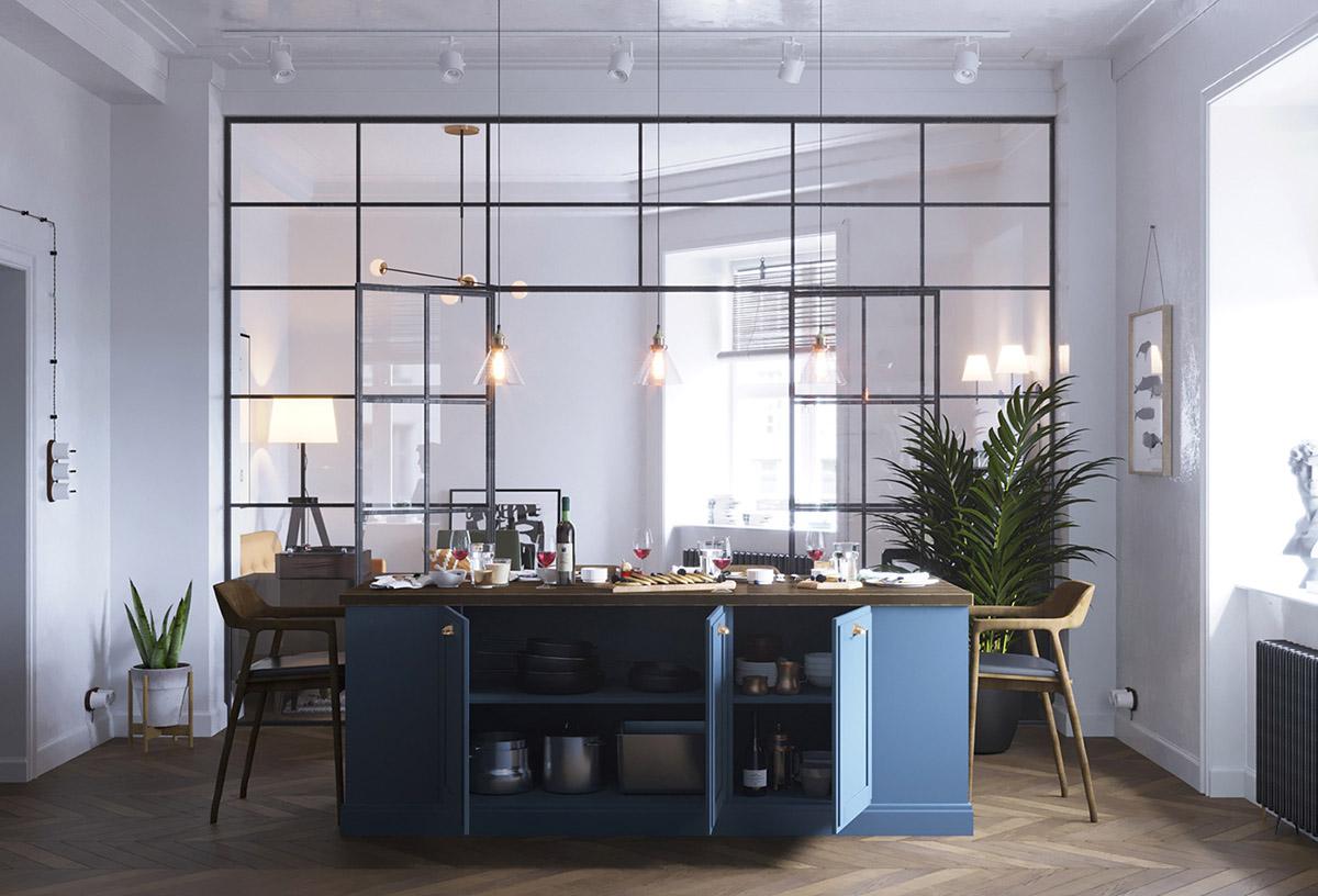 Todas y cada una de las plantas de interior que llenan el espacio entre los muebles, resultan ser acentos frondosos que dan vida y frescura a las estancias, suavizándoles y aportando calidez. La luz y como ésta incide sobre los colores es importante en este interior, donde se trata de iluminarlos para que creen una energía y armonía única en el espacio. La cocina es muy protagonista en este apartamento, donde los frentes y la isla central azul, funcionan magníficamente con un telón de fondo de baldosas blancas tipo metro. La gran celosía de metal y vidrio, con sus puertas, permiten que el salón compacto forme parte del espacio entretenido de la cocina o que se cierre al ruido y los aromas de una cocina en su uso diario y funcional. Una vajilla moderna llena los estantes, haciendo que el espacio de almacenamiento expuesto sea parte de la decoración de la vivienda. El solado de madera en espiga es otro de los elementos llenos de fuerza y calidez.