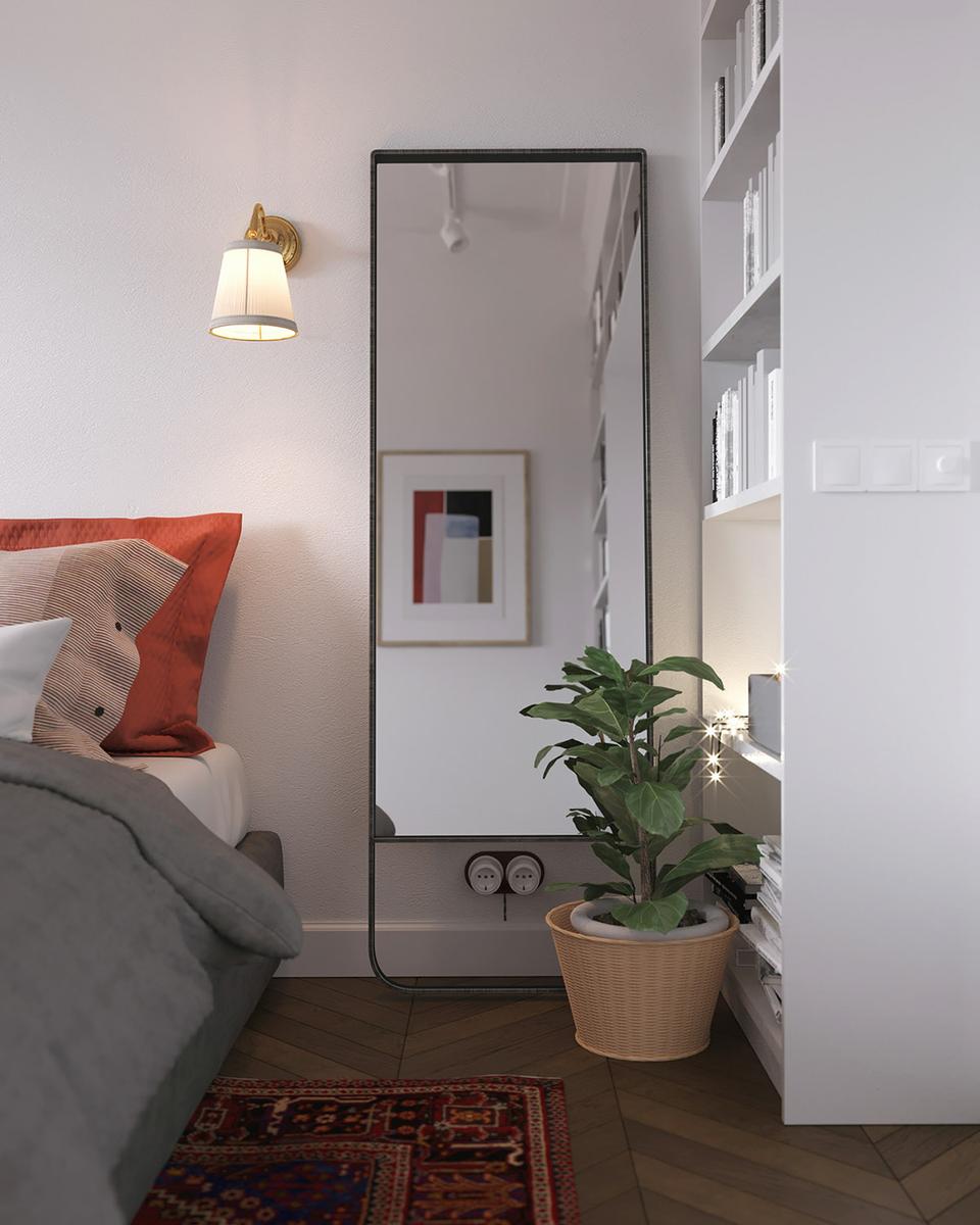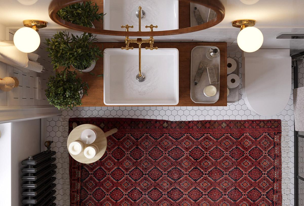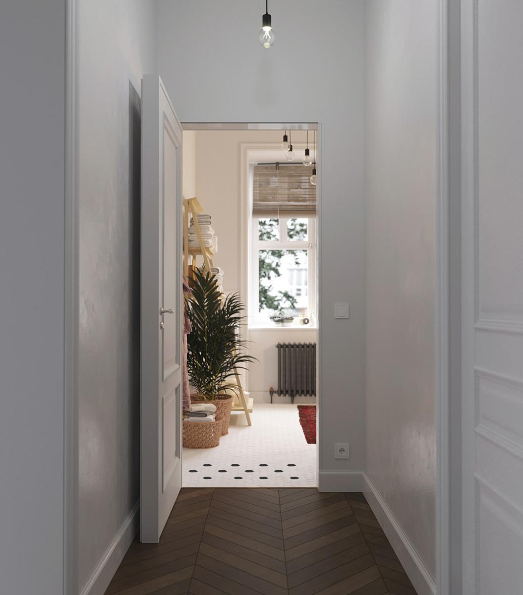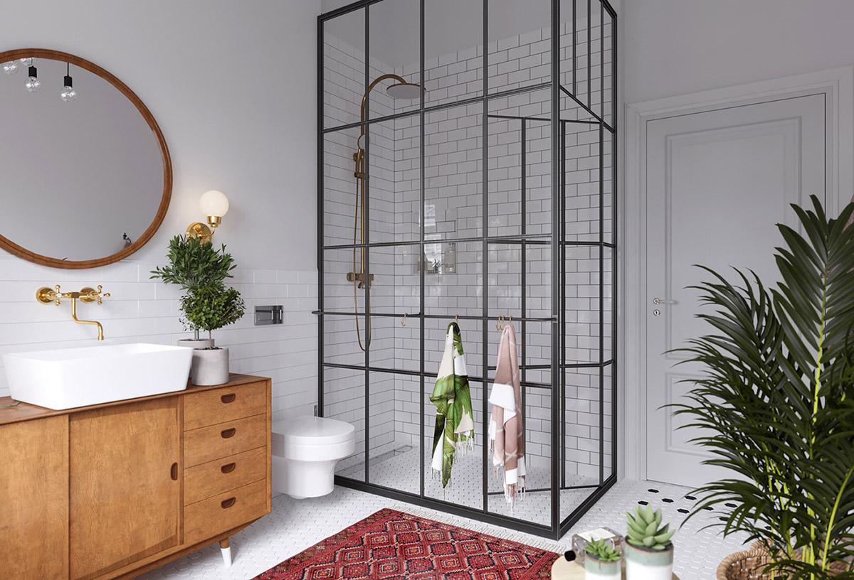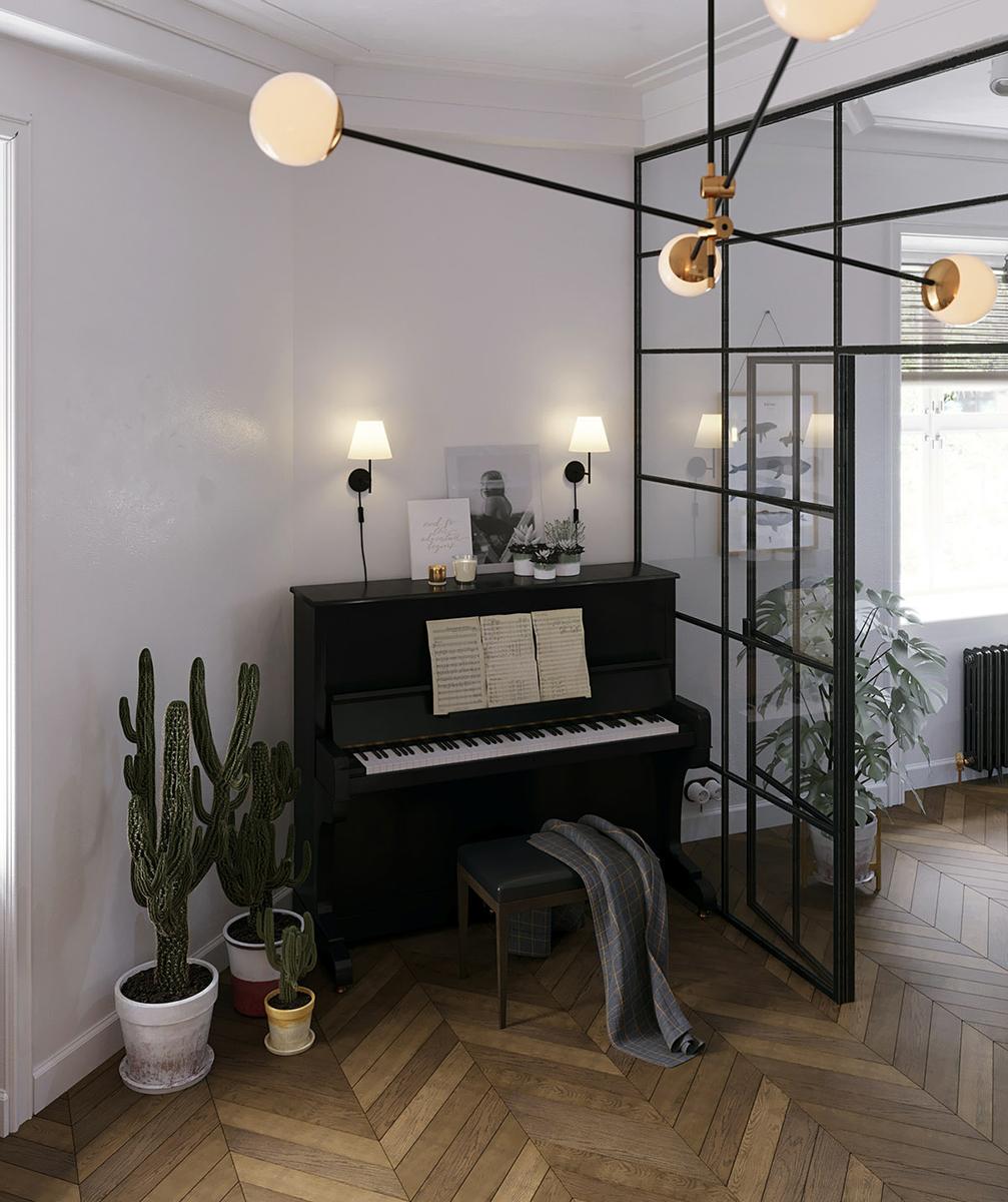 Todas y cada una de las plantas de interior que llenan el espacio entre los muebles, resultan ser acentos frondosos que dan vida y frescura a las estancias, suavizándoles y aportando calidez. La luz y como ésta incide sobre los colores es importante en este interior, donde se trata de iluminarlos para que creen una energía y armonía única en el espacio. La cocina es muy protagonista en este apartamento, donde los frentes y la isla central azul, funcionan magníficamente con un telón de fondo de baldosas blancas tipo metro. La gran celosía de metal y vidrio, con sus puertas, permiten que el salón compacto forme parte del espacio entretenido de la cocina o que se cierre al ruido y los aromas de una cocina en su uso diario y funcional. Una vajilla moderna llena los estantes, haciendo que el espacio de almacenamiento expuesto sea parte de la decoración de la vivienda. El solado de madera en espiga es otro de los elementos llenos de fuerza y calidez.