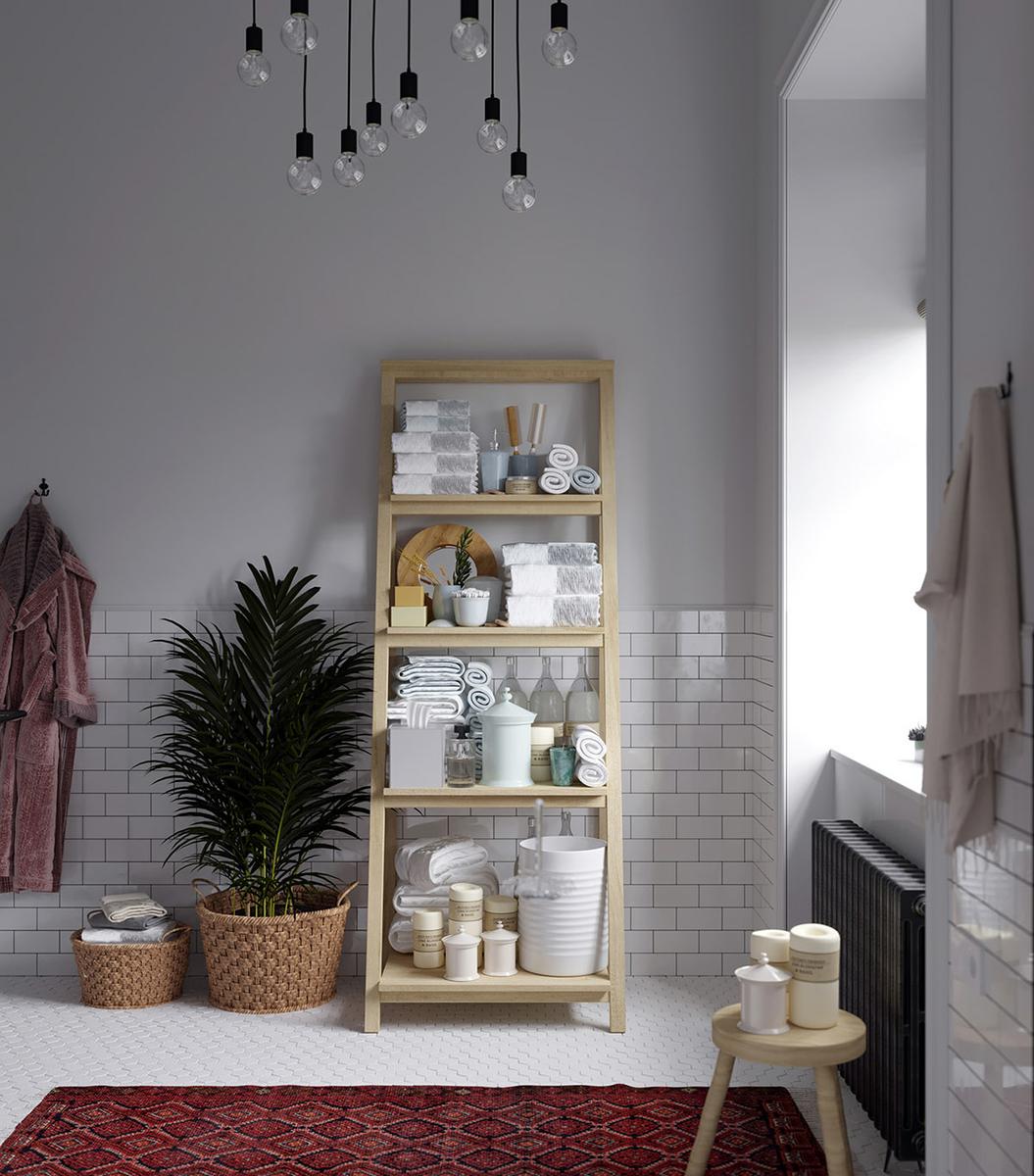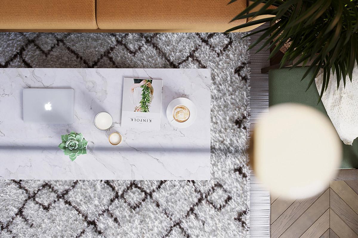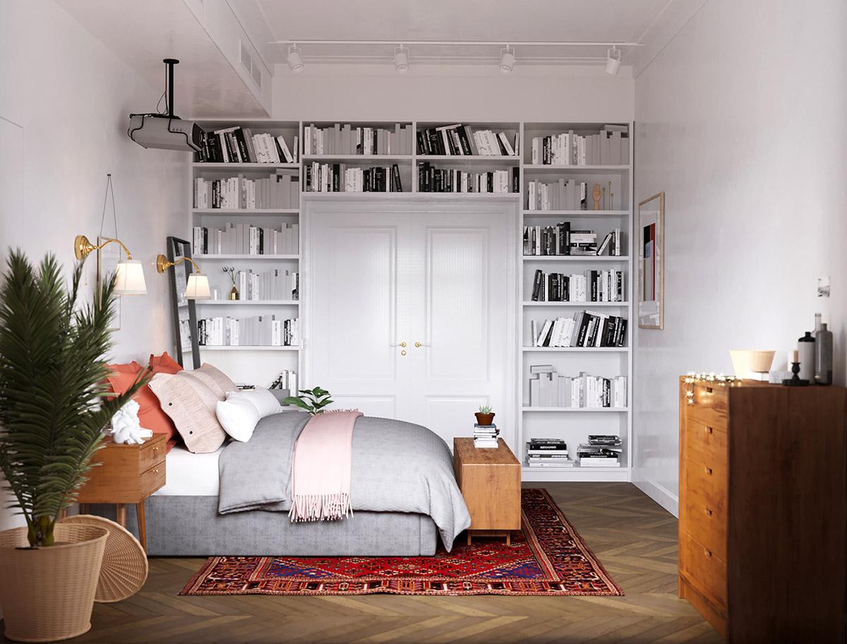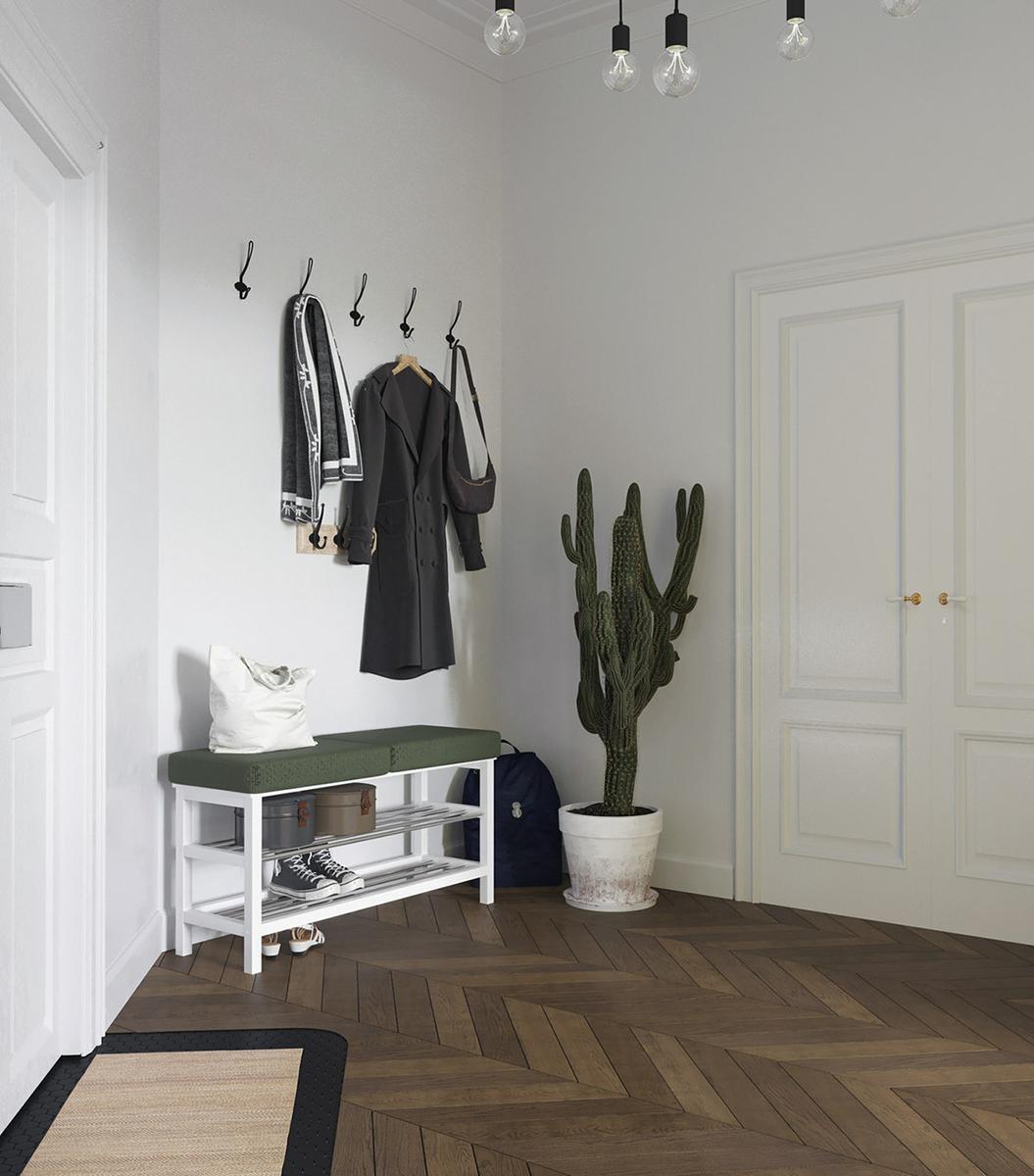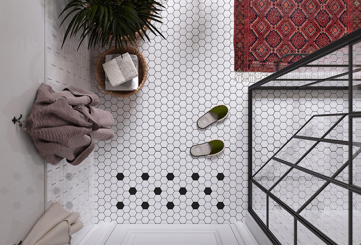 Todas y cada una de las plantas de interior que llenan el espacio entre los muebles, resultan ser acentos frondosos que dan vida y frescura a las estancias, suavizándoles y aportando calidez. La luz y como ésta incide sobre los colores es importante en este interior, donde se trata de iluminarlos para que creen una energía y armonía única en el espacio. La cocina es muy protagonista en este apartamento, donde los frentes y la isla central azul, funcionan magníficamente con un telón de fondo de baldosas blancas tipo metro. La gran celosía de metal y vidrio, con sus puertas, permiten que el salón compacto forme parte del espacio entretenido de la cocina o que se cierre al ruido y los aromas de una cocina en su uso diario y funcional. Una vajilla moderna llena los estantes, haciendo que el espacio de almacenamiento expuesto sea parte de la decoración de la vivienda. El solado de madera en espiga es otro de los elementos llenos de fuerza y calidez.