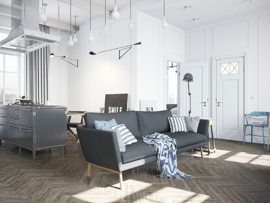 La decoración industrial vintage y el punto ecléctico e informal quedan patentes ya desde la puerta de entrada, donde descubrimos un armario con puertas blancas y letras de bienvenida, completamente integrado en el espacio, con un diseño original y que lo aleja de ser un simple elemento contenedor. La cocina es lo que más me gusta y no puede ser más industrial con el mobiliario en acabado metálico, pizarra y los elementos de menaje a la vista. Funcionalidad y diseño es un espacio práctico y versátil con mucho carácter. La zona de cocción se plantea en la isla central con una gran campana extractora. La mesa de comedor se adosa a la isla encimera y se integra perfectamente en el ambiente de cocina.