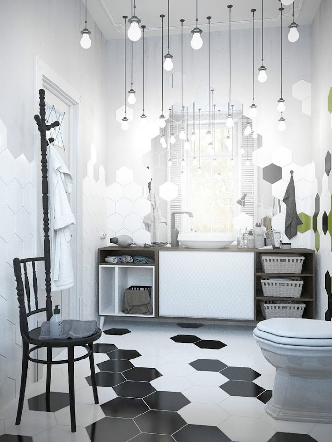 El dormitorio resulta un espacio original de la mano de una cama con dosel metálico en negro y una lámpara colgante de bombillas en distintas alturas. Un diseño muy efectista y lleno de creatividad que crea la estancia ideal para el descanso. El baño es otro de los rincones encantadores de este proyecto, en el que se juega con el color verde, blanco y negro con piezas cerámicas hexagonales. las protagonistas siguen siendo las bombillas colgantes.