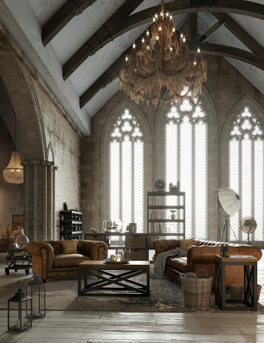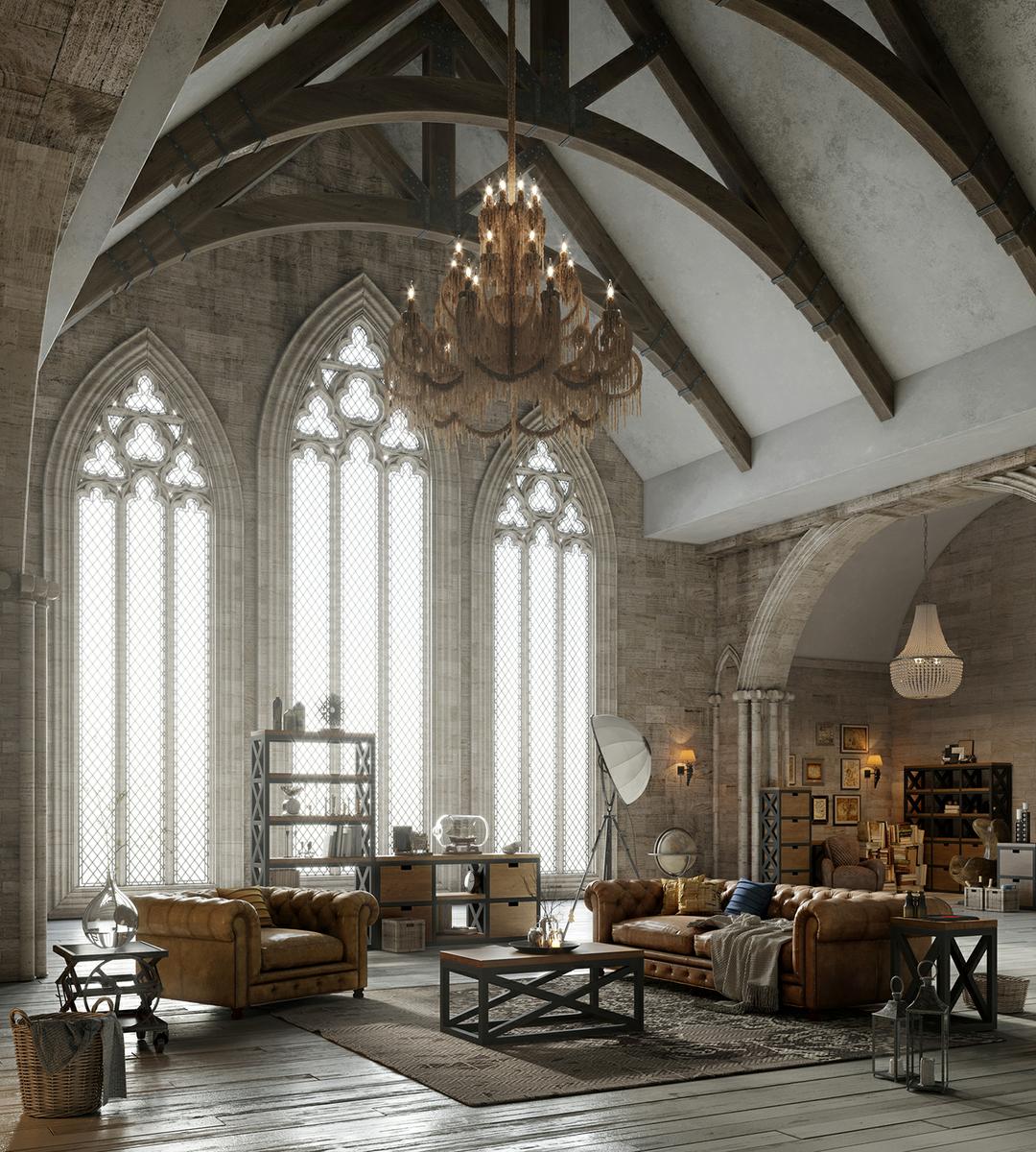 Las paredes de sillería y las cristaleras de estilo gótico, con archivoltas y columnas infinitas, enmarcan un espacio que se desarrolla completamente comunicado y abierto, donde la zona social y la privada, juegan con piezas de mobiliario para diferenciarse.