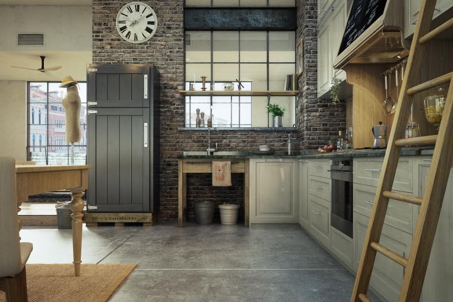 Espacioso y vibrante, este loft sería ¡mi casa perfecta!. Llena de luz, techos altos, materiales fabriles como el hormigón y el ladrillo, y mucho estilo industrial, este proyecto de loft parte de un espacio social completamente abierto y comunicado donde la cocina, el comedor, el salón comparten espacio. Como si de una nave se tratara, el techo a dos aguas se complementa con lucernarios que hacen que la luz penetre y bañe todo el espacio. Los muros de ladrillo visto en la cocina acentúan la calidez de la madera de todo el mobiliario, jugando con las lámparas industriales, la carpintería metálica en negro que permite el paso de la luz... La cocina es ¡increíble!, simplemente perfecta.