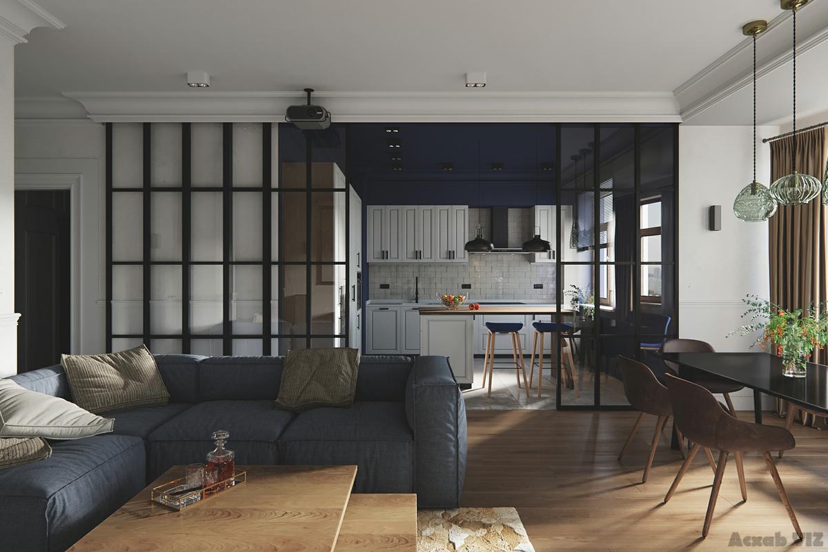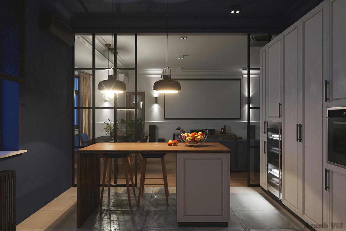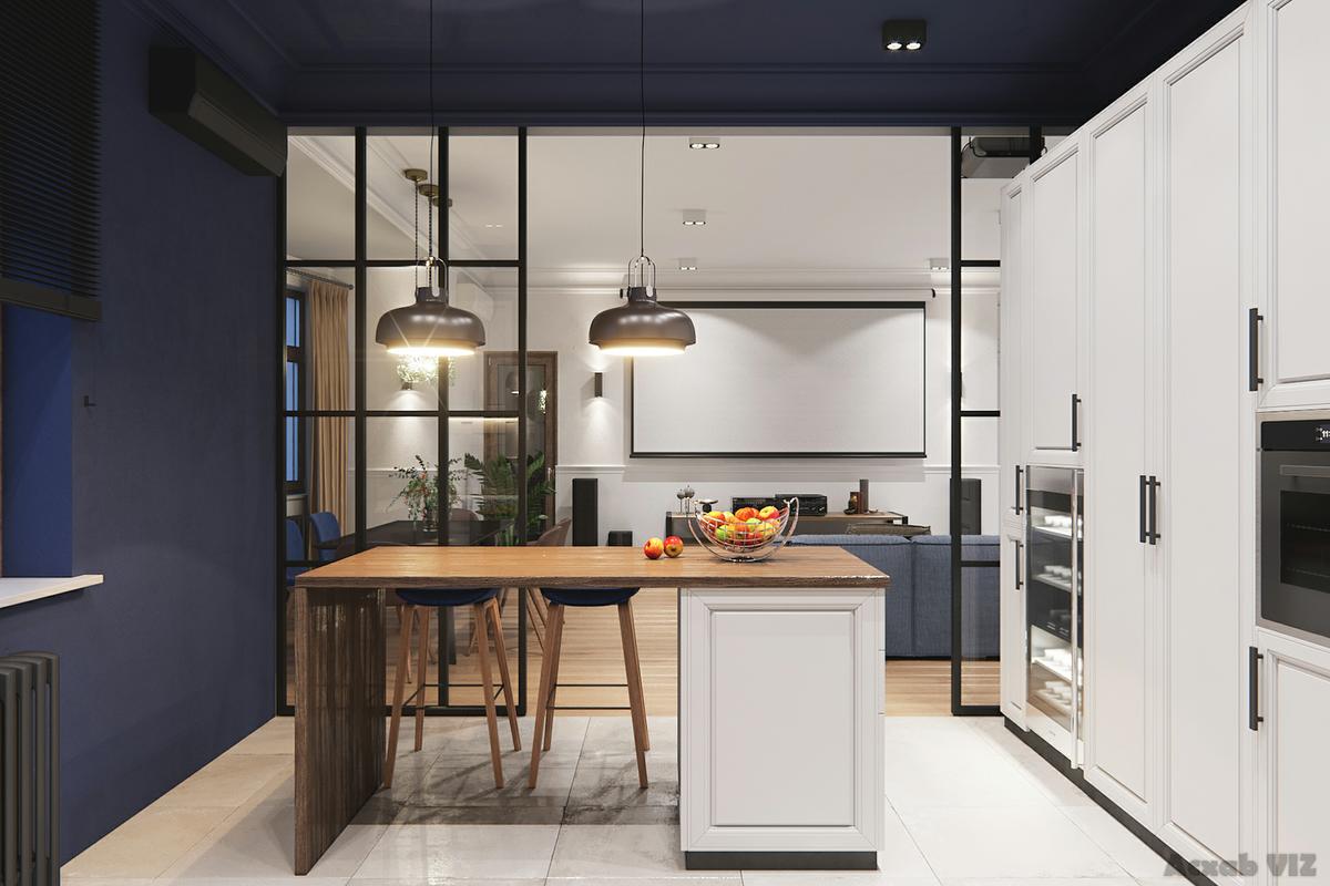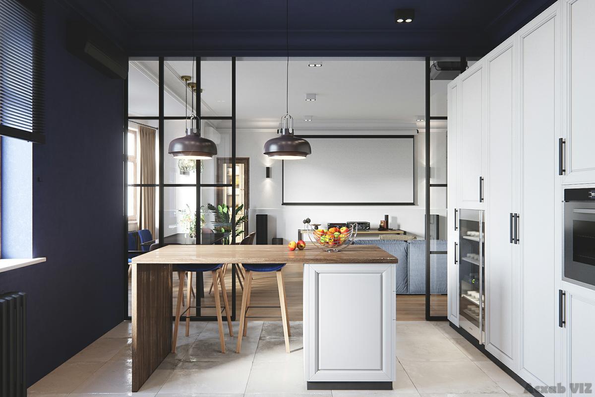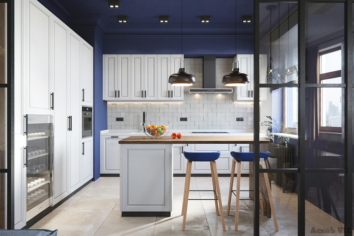 La cocina se diseña en un estilo rústico renovado donde el acento en azul destaca ubicándose en el techo de forma original y en la pared lateral. Esto crea profundidad en el espacio.