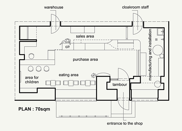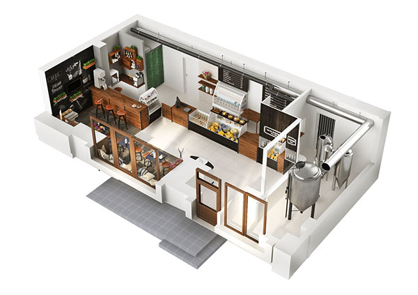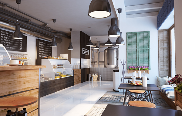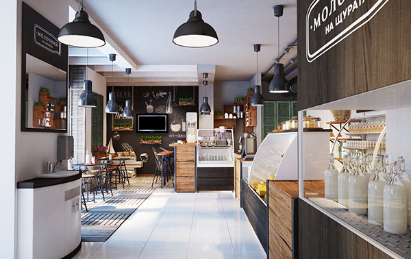 Este proyecto de lechería situado en Ucrania es un diseño de lleno de calidez. En pocos metros cuadrados se distribuye una zona de atención al público ( tienda ) de leche fresca, una zona de manufactura y tratamiento del producto y una zona de mesas para consumo a modo de cafetería que no se olvida del espacio para los más pequeños con una pared de pizarra. Pensado al detalle, los materiales aportan ligereza y versatilidad a un espacio de atención al público. En el área de mesas para consumo el solado es de baldosas en gran formato de madera creando un área cálida y acogedora. Los grandes ventanales aportan toda la luz natural de la calle y las contraventanas en madera regulan esa entrada.