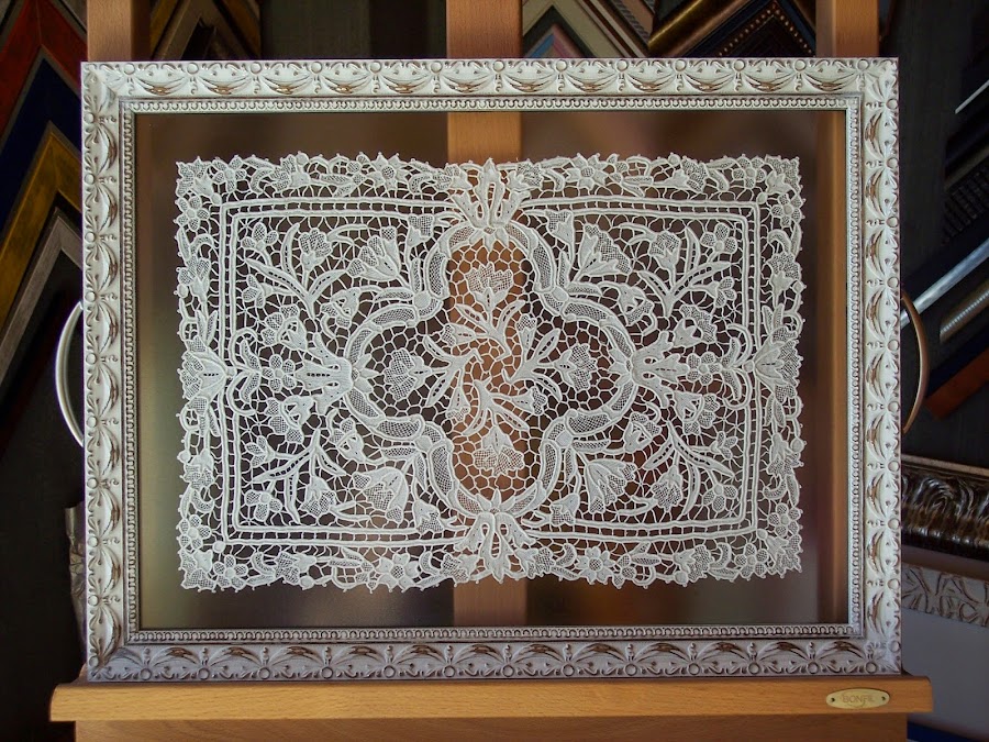 Está colocada entre dos cristales, pero igualmente se habría podido colocar un paspartour en color oscuro ( rojizo o azul ), para destacar el bolillo.