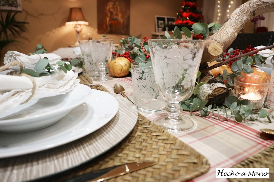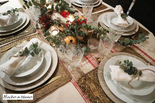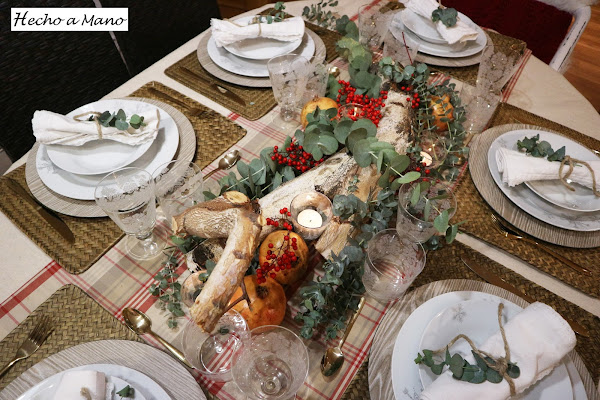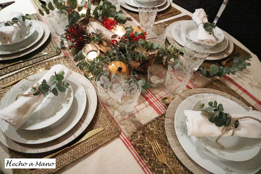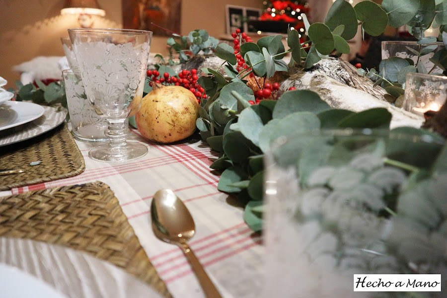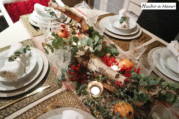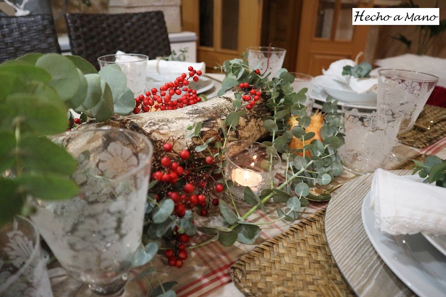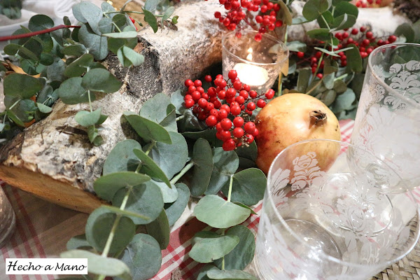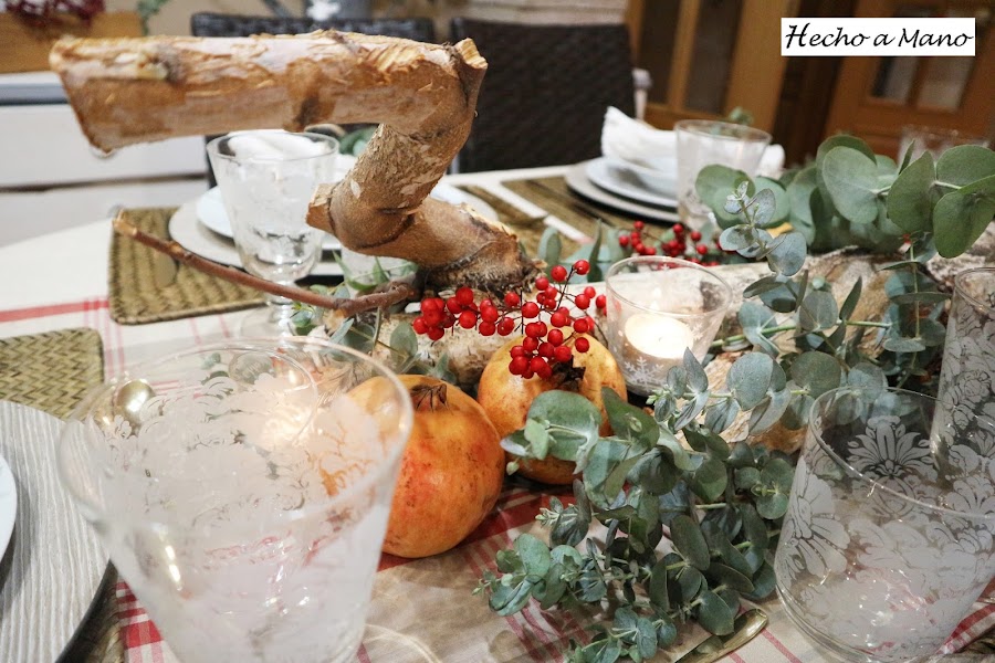 En toda mesa es importantísimo el arreglo central, que en ésta ocasión consta de elementos naturales: un tronco de árbol, eucalipto, bayas como toque rojo, granadas y unos pequeños vasitos con velas.