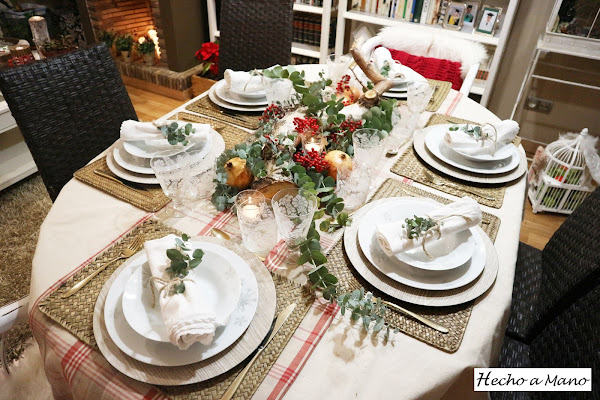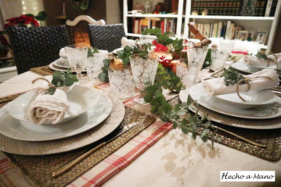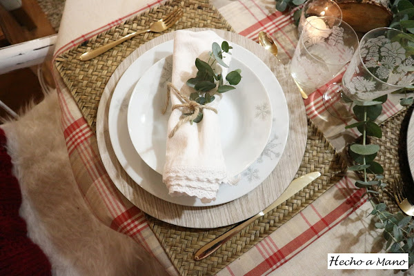 Cada servicio es de porcelana blanca y como decoración tiene unas estrellas de la Navidad muy sutiles y delicadas. La cubertería es dorada. Todo ello descansa sobre bajoplatos de madera desgastada y a su vez sobre individuales de fibra natural.
