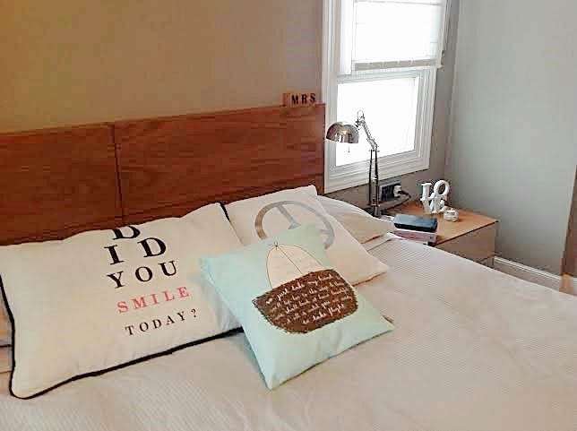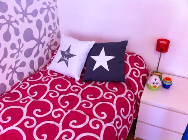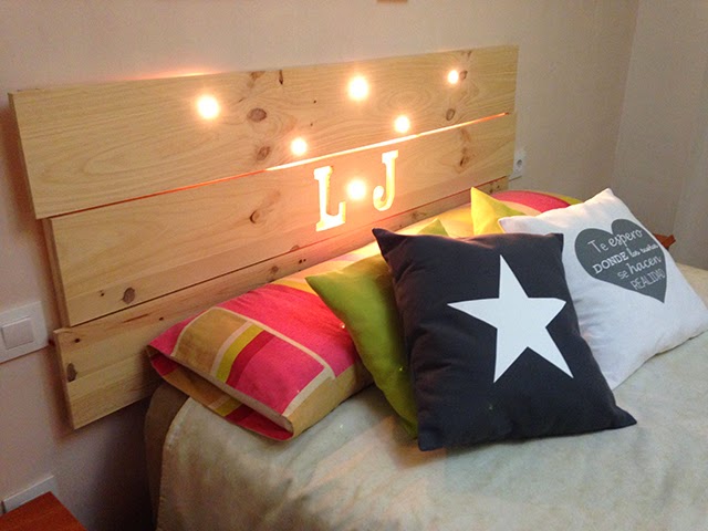Lorena, Sucre y su cabecero de maderas DIY esta mujer es una artista, si queréis ver el paso paso podeís verlo pulsando aquí, en su cama vemos cojín estrella y cojín "te espero donde los sueños se hacen realidad" me encanta! (clic y clic)