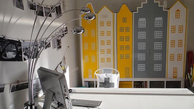 El despacho de Bruno, ¿No me digáis que la pareja GRIS-AMARILLO no es todo un acierto? el cojín cruz asoma sigilosamente pero ahí esta compartiendo espacio y gama cromática (clic aquí)