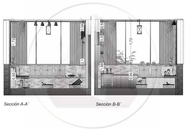 Utilizamos una paleta en tonos claros y el verde relajante de las plantas. La madera del techo está presente en la bancada y en el toallero natural con ramas, el carrito para transportar bebidas y los cuencos. Las cestas de mimbre bajo el banco-rinconero son perfectas para toallas o mantitas en invierno, juguetes y lecturas.Pizarra orientativa
