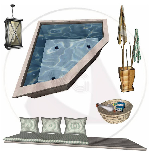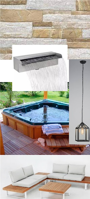 Buscamos una distribución con el espacio central despejado, sin mesitas, donde extender toallas y tomar el sol, jugar o leer. El elemento agua en nuestro patio es un jacuzzi en esquina y con luces, provisto de un caño-fuente en cascada. Como asiento un banco rinconero en madera alistonada con colchonetas, y en las extensiones finales superficie libre a modo de mesitas para colocar lecturas, bebidas, faroles o plantas.