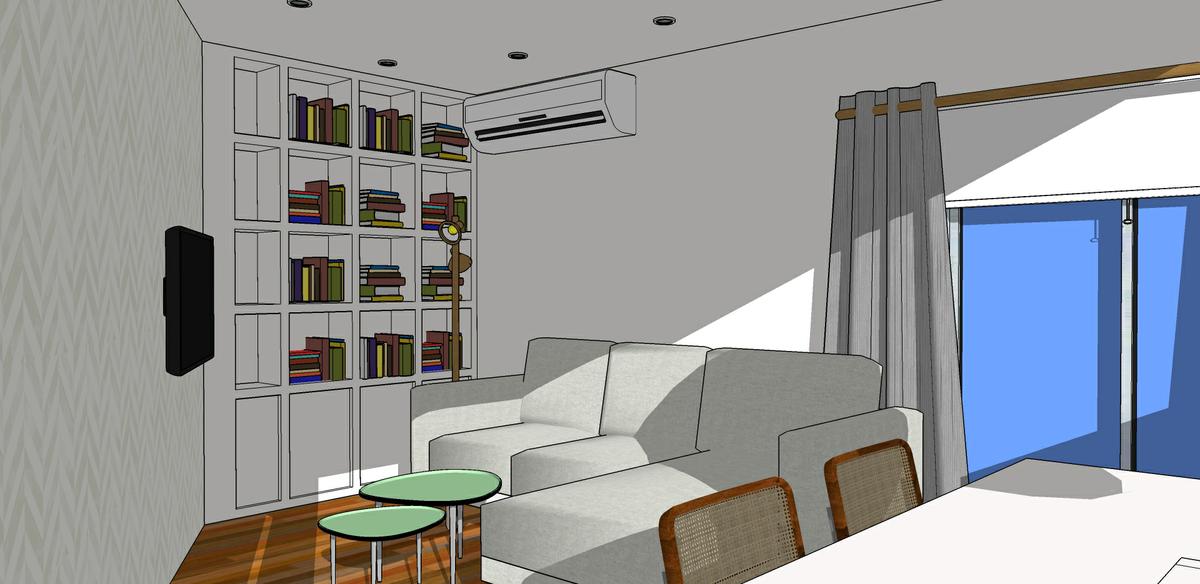 Para la distribución, les propuse aprovechar el fondo con una librería a medida únicamente para almacenaje, ubicar la zona de estar en ese vértice y colgar la TV en la pared en diagonal para dejarla frente al sofá. Y trasladar en cambio, la zona de comedor al paso entre la entrada y la terraza, de modo que no quedara encajonado e inaccesible al fondo.