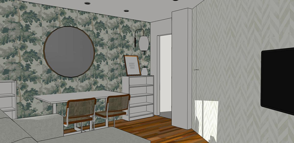 Para dar luminosidad y alegría, y refrescar el espacio, propusimos papeles pintados en la pared frente al sofá, pero tampoco podía contener mucho colorido porque hacia esa zona miraban directamente desde el sofá, para ver la televisión.