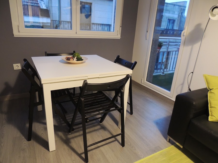 Al fondo y junto la puerta de la terraza, colocamos una mesa extensible con cuatro sillas plegables que no ocupan nada de espacio. Así ganamos una zona extra para recibir invitados, para trabajar con el ordenador (ya que es una zona con mucha luz) o para organizar cenas con amigos.
