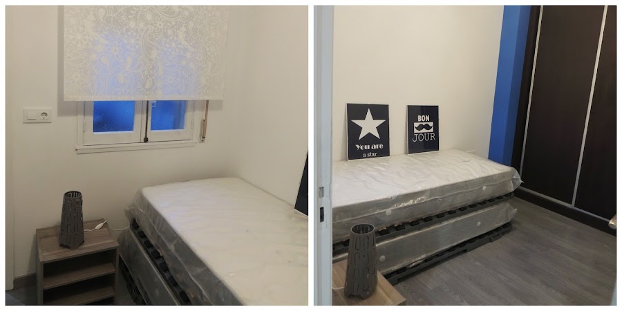 En la pequeña habitación de invitados, colocamos una cama nido por si venía una pareja, para que pudieran dormir más cómodamente. No quisimos saturar la habitación porque no son más metros que los que se ven en la imagen de la derecha, y si los nuevos inquilinos necesitan ese espacio, no queríamos que se encontraran con algún elemento que se lo impidiera.