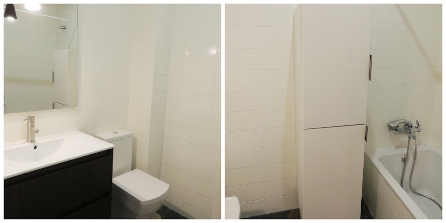 En el baño, pintamos los antiguos azulejos con pintura blanca. ahorrando tiempo y dinero. Dejamos además la antigua bañera ya que estaba en perfecto estado y sustituimos el sanitario y el mueble del labavo por uno más moderno.