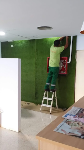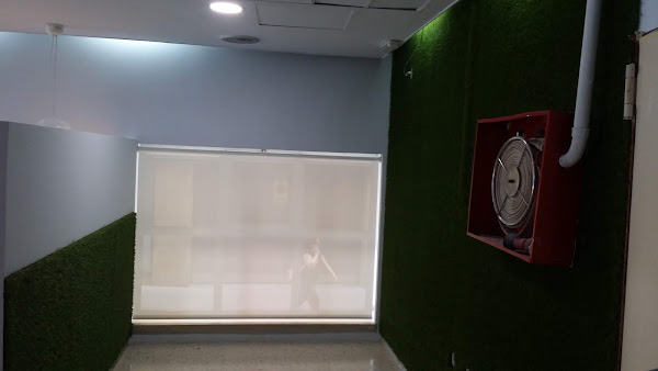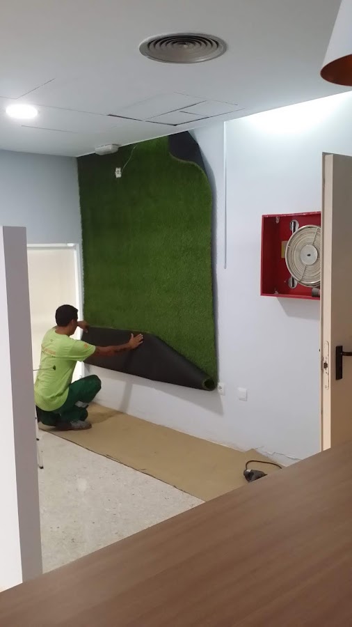 Instalación de césped artificial en la zona de consignas y bicicletas, cortinas de screen, iluminación, mobiliario, rodapié de haya.