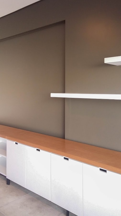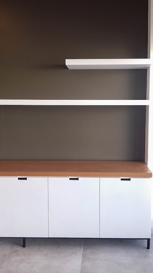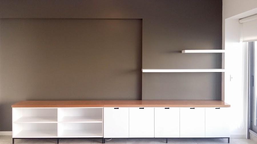 * Se realizó mueble para la TV con lugar de guardado y estantes flotantes. El mueble para la TV tiene una estructura base realizada en caño de hierro color negro (pintado al fuego), cuerpo totalmente laqueado en color blanco y tapa en madera de lenga con lustre poliuretanico. Los estantes flotantes se laquearon en color blanco.